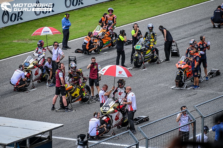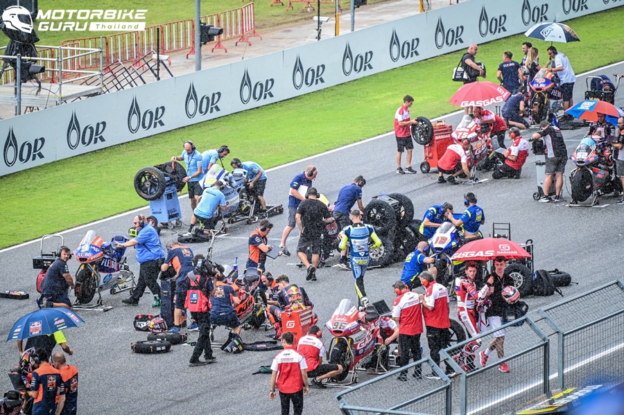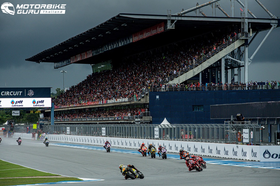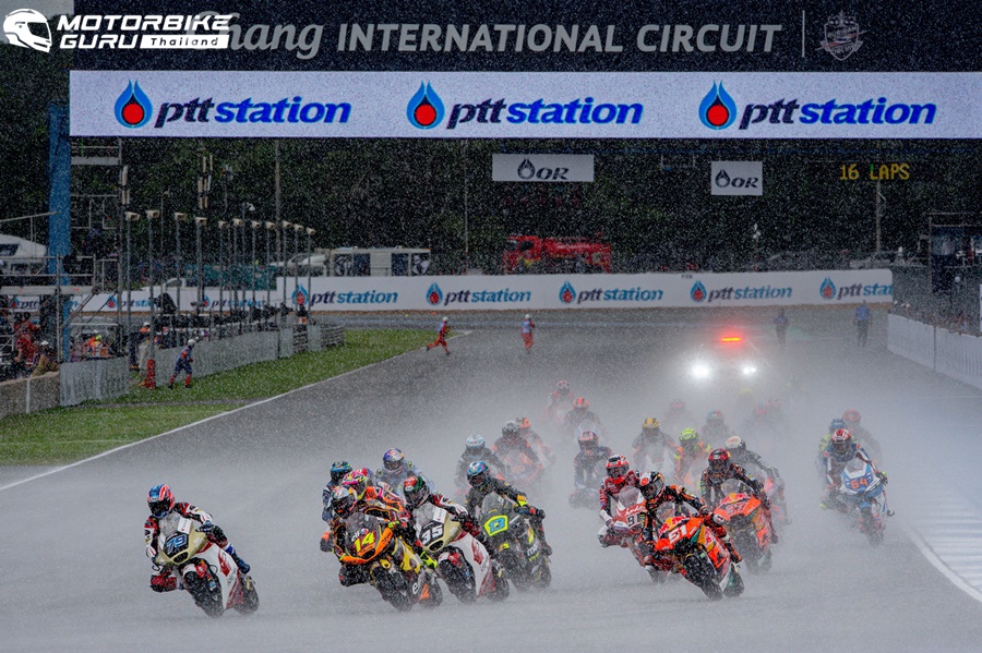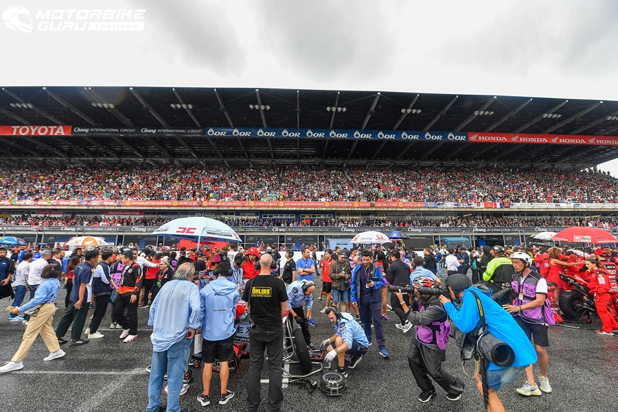 ส่วนรุ่นใหญ่อย่าง โมโตจีพี ต้องล่าช้าออกไปกว่า 1 ชั่วโมงจากฝนที่ถล่มลงมาอย่างหนัก แต่แฟนความเร็วชาวไทยก็ไม่ย่อท้อ โดยเรซนี้ต้องดวลในสภาพแทร็กเปียก