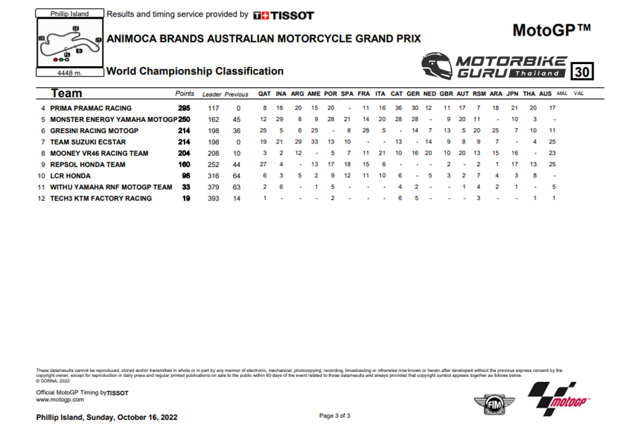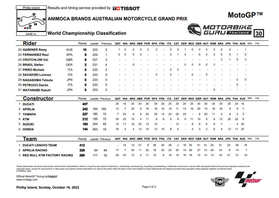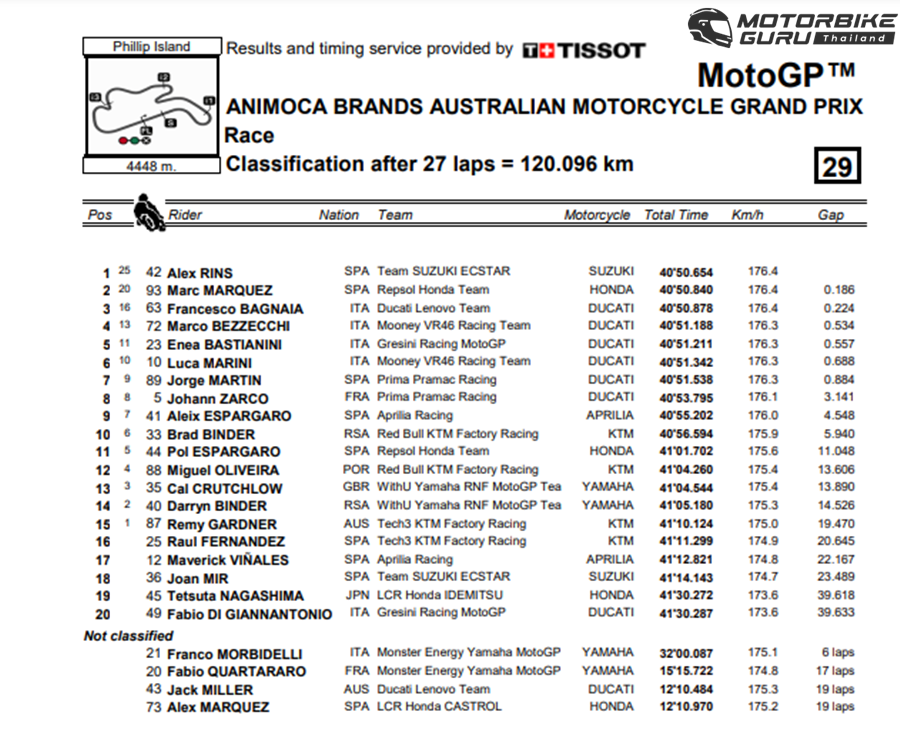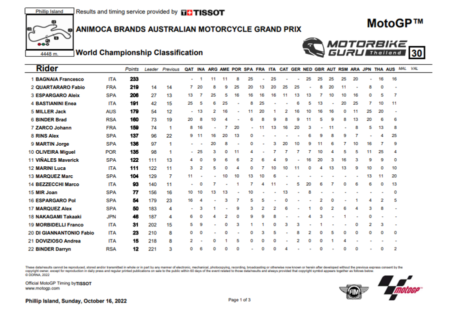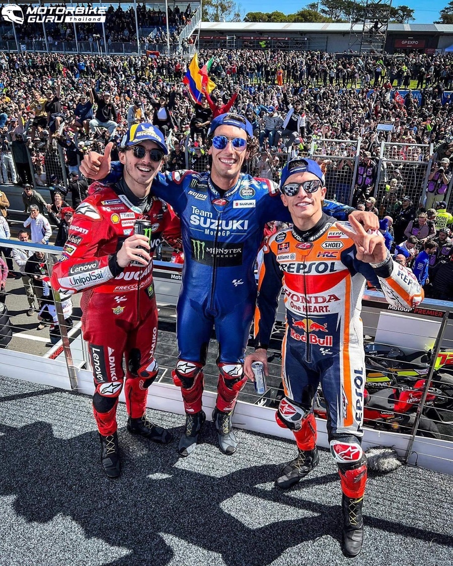 Alex Rins สามารถจาก Team Suzuki Ecstar พลิกโผคว้าชัยชนะใน Animoca Brands Australian Motorcycle Grand Prix ที่ Phillip Island ในประเทศออสเตรเลีย ซึ่งจะเป็นการแข่งขันที่น่าจดจำไปตลอดกาลกับการพา Suzuki คว้าชัยในอันดับ 1 บนโพเดี้ยมก่อนที่ทีมจะถอนตัวเมื่อสิ้นฤดูกาล ด้าน Fabio Quartararo จาก Monster Energy Yamaha MotoGP ก็พลาดล้มออกจากการแข่งขัน นั่นทำให้ Francesco Bagnaia จาก Ducati Lenovo Team ขยับขึ้นมาเป็นผู้นำคะแนนสะสม (ทิ้งห่าง 14 แต้ม) มีลุ้นคว้าแชมป์ในปีนี้ ด้าน Marc Marquez จาก Repsol Honda TEAM สามารถคว้าโพเดียมครั้งที่ 100 ไปได้สำเร็จ