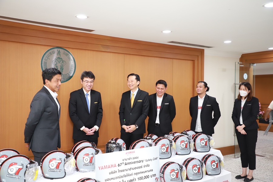 มร.ทัตสึยะ โนซากิ ประธานกรรมการบริหาร, นายพงศธร เอื้อมงคลชัย รองประธานกรรมการบริหาร พร้อมด้วยคณะผู้บริหารระดับสูง บริษัท ไทยยามาฮ่ามอเตอร์ จำกัด ถ่ายภาพร่วมกับ นายชัชชาติ สิทธิพันธุ์ ผู้ว่าราชการกรุงเทพมหานคร ในการส่งมอบหมวกนิรภัย YAMAHA 67th Anniversary "Safety มีสติ" รุ่น Limited Edition จำนวน 100 ใบ มูลค่า 100,000 บาท