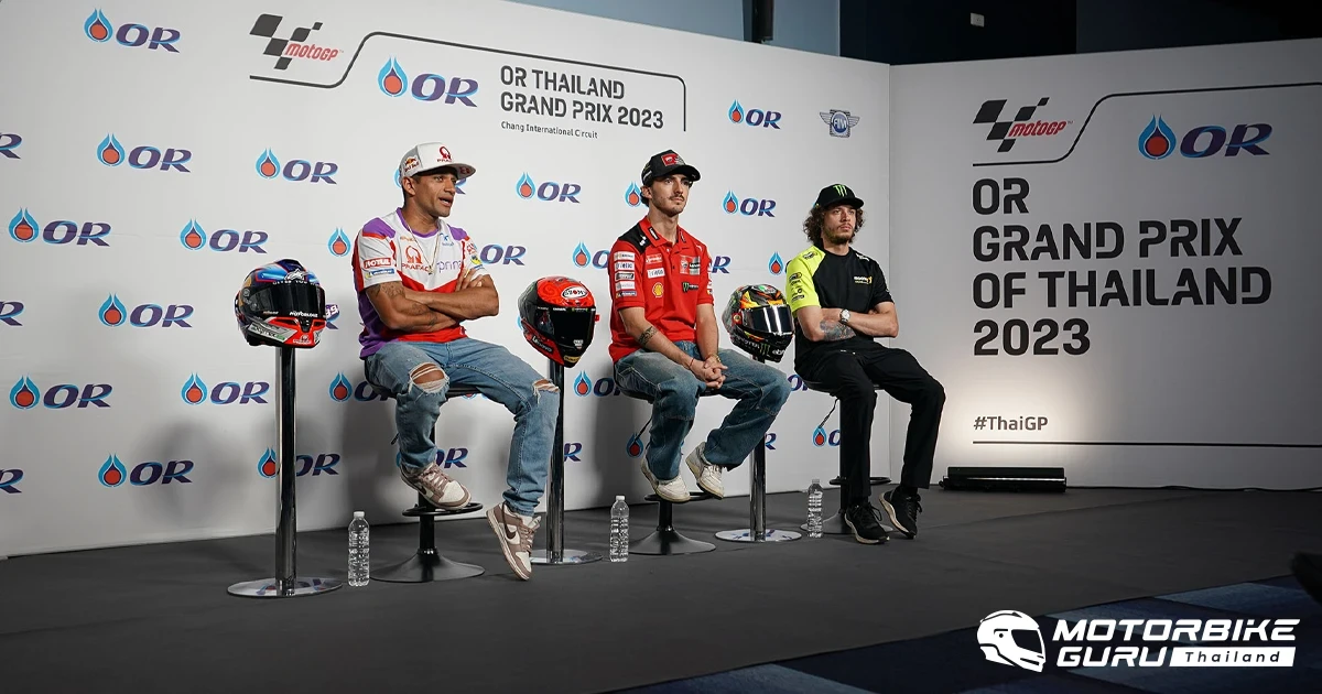 ยอดนักบิดชื่อดังในศึก MotoGP นำโดยแชมป์โลกอย่าง ฟรานเชสโก้ บันยาญ่า นักบิดอิตาเลียนจากดูคาติ และคู่แข่งคนสำคัญชาวสแปนิชอย่าง ฮอร์เก มาร์ติน และ มาร์โก เบซเซ็คคี รวมถึงสตาร์ชาวไทยอย่าง ก้อง-สมเกียรติ จันทรา จาก อิเดมิตสึ ฮอนด้า ทีม เอเชีย ร่วมแถลงข่าวก่อนแข่ง หลังลงสำรวจแทร็ก สนามช้าง อินเตอร์เนชั่นแนล เซอร์กิต จ.บุรีรัมย์ ก่อนลงดวลช่วงสำคัญในการลุ้นแชมป์โลกสุดสัปดาห์นี้ในศึก โออาร์ ไทยแลนด์ กรังด์ปรีซ์ ขณะแฟนชาวไทยตื่นตาตื่นใจรอชมเรซระดับโลกในบ้านเกิด