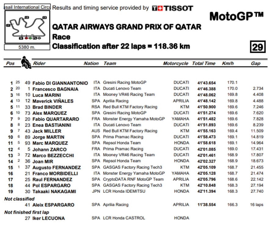 หลังจากนั้นก็เข้าสู่ช่วงเรซหลักของ Qatar Airways Grand Prix of Qatar ซึ่งเป็นเรซที่ยอดเยี่ยมด้วยชัยชนะของ Di Giannantonio ซึ่งเป็นการขี่ตามหลัง Bagnaia เป็นส่วนใหญ่ และในที่สุดก็สามารถขึ้นมานำ และเป็นผู้ชนะการแข่งขัน ส่วน Martin กลับต้องเผชิญกับการสตาร์ทที่ไม่ดี ทำให้อันดับหล่นลงไปถึงอันดับที่ 10 แต่ Bagnaia ก็ไม่สามารถชนะการแข่งขันได้ ส่งให้ Di Giannantonio ได้ชัยชนะแรกไปครอง ส่วนอันดับ 3 เป็นของ Marini