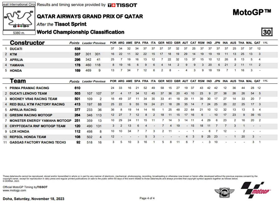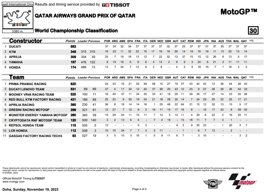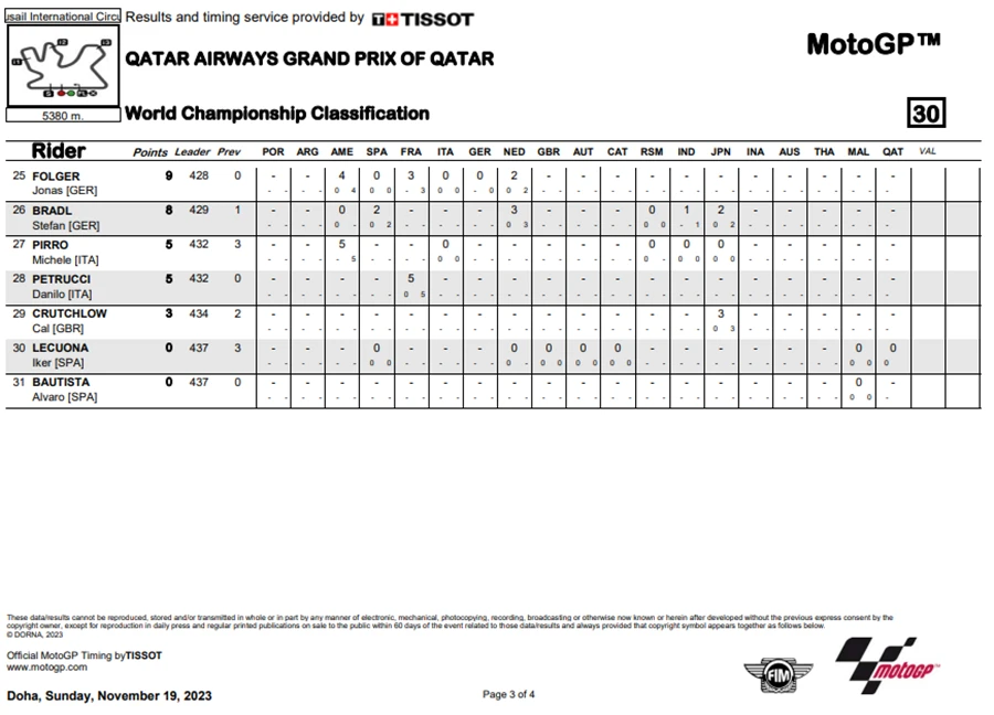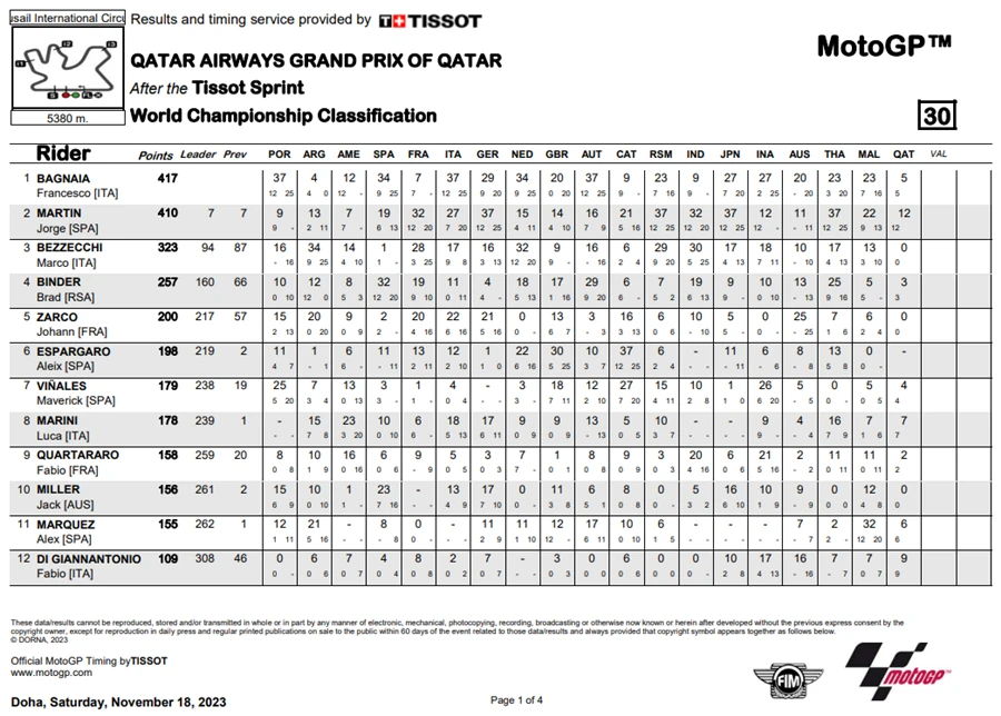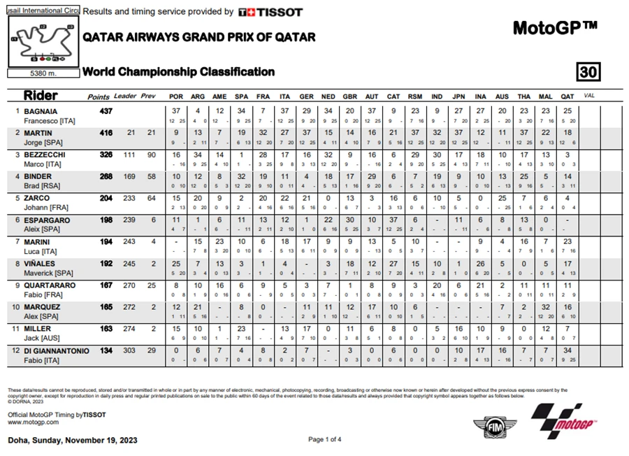 การแข่งขันในสนามที่ 19 ของ MotoGP 2023 ซึ่งเป็นสนามรองสุดท้ายแล้วของปีนี้ โดยการแข่งขัน QatarGP ในรายการ Qatar Airways Grand Prix of Qatar ที่สนาม Lusail International Circuit โดยชัยชนะตกเป็นของ Fabio Di Giannantonio จาก Gresini Racing MotoGP ซึ่งระหว่างการแข่งขัน Francesco Bagnaia จาก Ducati Lenovo Team ขึ้นนำแต่ก็โดน Di Giannantonio แย่งตำแหน่งผู้ชนะ แต่การได้อันดับ 2 ของ Bagnaia ทำให้คะแนนสะสมยังคงนำอยู่า 21 คะแนน ส่วนอันดับที่ 3 เป็นของ Luca Marini จาก Mooney VR46 Racing Team นั่นทำให้โพเดียมของ QatarGp เป็นนักบิดอิตาเลียนทั้งหมด