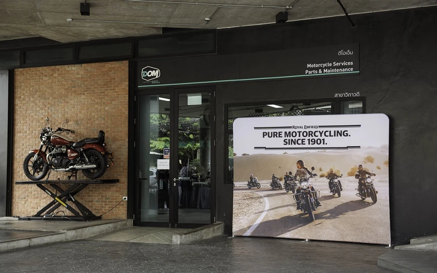 Royal Enfield Vibhavadi 20 by Britbike ตั้งอยู่บริเวณอาคารดีโอเอ็ม โดยนายดอม เหตระกูล ผู้ก่อตั้งอาคารและบริษัทบริทไบค์ จำกัด ซึ่งโชว์รูมยังคงกลิ่นอายและบรรยากาศการตกแต่งแบบคลาสสิกวินเทจเฉพาะตัวของโรยัล เอ็นฟีลด์ พร้อมทั้งคงมาตรฐานการให้บริการระดับสากล ภายในโชว์รูมย่านวิภาวดีแห่งนี้ มีรถจักรยานยนต์ให้ลูกค้าได้ทดลองขับขี่และสั่งจองอย่างหลากหลาย ได้แก่ Hunter 350, Classic 350, Meteor 350, Super Meteor 650, Interceptor 650, Continental GT 650, Scram 411, Himalayan, และ Bullet 350 พร้อมทั้งการบริการก่อนและหลังการขายอย่างเต็มรูปแบบ ซึ่งรวมไปถึงบริการซ่อมบำรุงและอะไหล่ครบวงจรที่ให้บริการโดยช่างผู้ชำนาญการ สำหรับลูกค้าท่านใดที่สนใจสินค้า เสื้อผ้า และอุปกรณ์ตกแต่งแท้จาก Royal Enfield สามารถเลือกซื้อได้ ณ โชว์รูมวิภาวดี 20 แห่งนี้เช่นกัน
