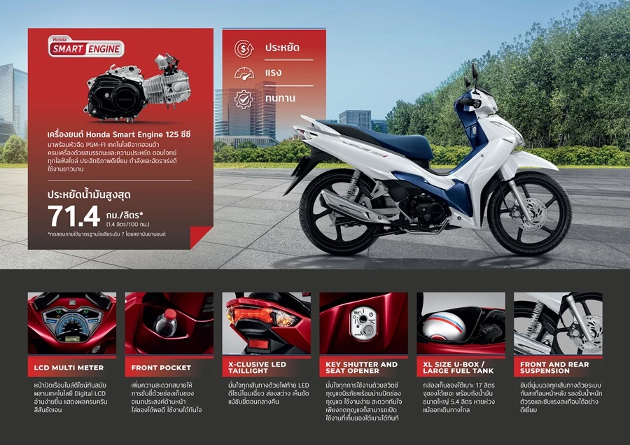 New Honda Wave125i มาพร้อมคอนเซปต์ ผู้นำที่ทุกคนเชื่อมั่น สะท้อนความเป็นผู้นำด้วยดีไซน์ที่โฉบเฉี่ยว โดดเด่นยิ่งขึ้นด้วยสีสันใหม่เฉดทูโทน ผสานความเรียบหรู ลงตัวกับชุดไฟหน้า Full LED Headlight และไฟท้ายดีไซน์ X-Clusive LED Tailight แผงหน้าปัดเรือนไมล์แบบ LCD Multi Meter เรียบหรูมีมิติ ออกแบบแยกส่วน บอกข้อมูลการขับขี่ครบครัน อีกทั้งเพิ่มความสะดวกสบายให้การขับขี่ด้วยช่องเก็บของอเนกประสงค์ด้านหน้า และช่องเก็บของใต้เบาะขนาดความจุ 17 ลิตร สามารถใส่หมวกกันน็อกได้แบบเต็มใบ เพิ่มความมั่นใจในการขับขี่ด้วยระบบกันสะเทือนหน้าหลัง รองรับน้ำหนักตัวรถและซับแรงสะเทือนได้อย่างดีเยี่ยม