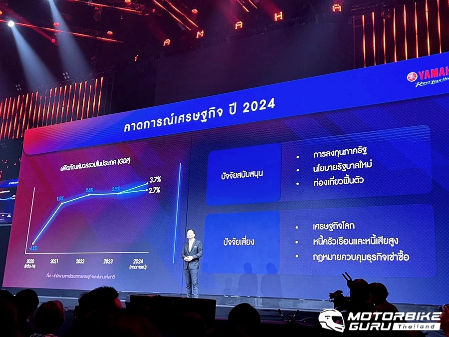 ในปี 2567 นี้ แม้การคาดการณ์ตลาดรวมรถจักรยานยนต์ภายในประเทศจะลดลงมาถึง 9% โดยมียอดจดทะเบียนอยู่ที่ประมาณ 1.71 ล้านคัน ซึ่งมีผลมาจากปัจจัยเสี่ยงของปัญหาเศรษฐกิจโลกที่ผันผวน ปัญหาหนี้ครัวเรือน และหนี้เสียที่สูงขึ้น รวมถึงกฎหมายควบคุมดอกเบี้ยเช่าซื้อที่จะส่งผลกระทบต่อผู้บริโภค ส่วนปัจจัยบวกเกิดจากภาพรวมการท่องเที่ยวที่ฟื้นตัว การลงทุนเพิ่มจากภาครัฐ และนโยบายการควบคุมราคาน้ำมันเชื้อเพลิง