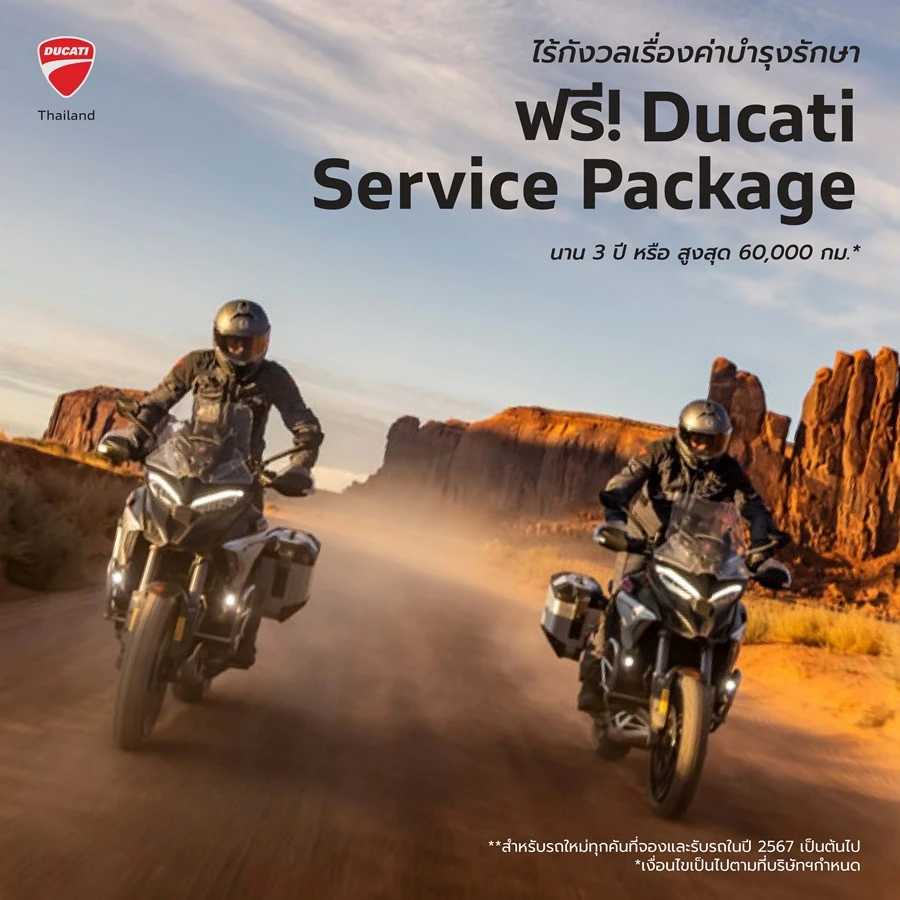 และบริษัทฯ ยังจัด Ducati Service Package เพื่อสร้างความอุ่นใจ คลายทุกความกังวลให้ลูกค้าที่ออกรถดูคาติทุกรุ่นในปีนี้เป็นพิเศษ โดยลูกค้าสามารถนำรถเข้ามารับการบริการตามรอบได้โดยไม่เสียค่าบริการนานถึง 3 ปี หรือระยะทาง 60,000 กิโลเมตร นอกจากนี้ บริษัทฯ ยังรับประกันอะไหล่ทุกชิ้นที่เปลี่ยนจากศูนย์บริการนานถึง 2 ปี และรับประกันงานซ่อมให้ลูกค้านานถึง 6 เดือน
