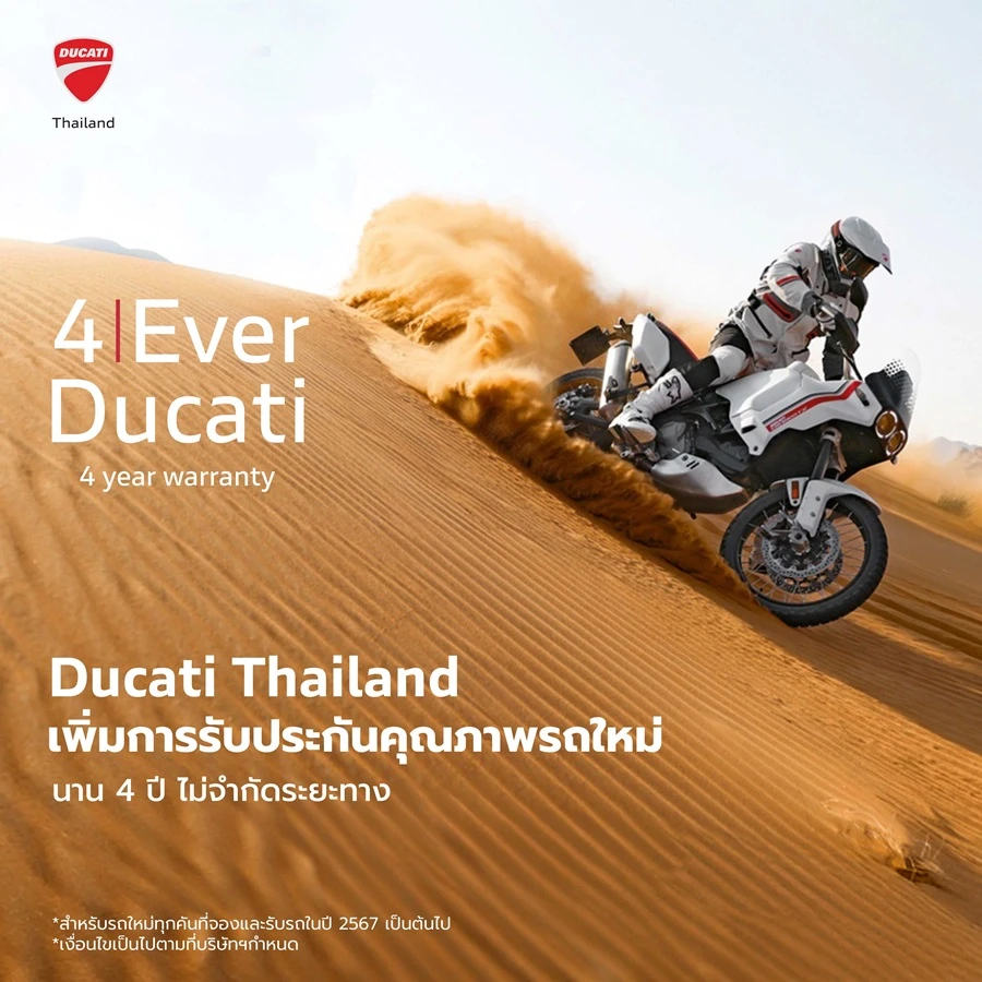 ดูคาติ ในประเทศไทย อย่างเป็นทางการ เปิดเผยว่า เพื่อสร้างความพึงพอใจสูงสุดให้ลูกค้า ภายใต้กลยุทธ์บริการหลังการขายนำขาย ตั้งแต่เดือนมีนาคม 2567 นี้ ดูคาติ ประเทศไทย ได้มีการเพิ่มระยะเวลาการรับประกันตัวรถ หรือ วารันตี จากเดิม 3 ปีเป็น 4 ปี เพื่อเป็นการตอกย้ำถึงคุณภาพของรถดูคาติและสร้างความสบายใจให้กับลูกค้าทุกท่าน