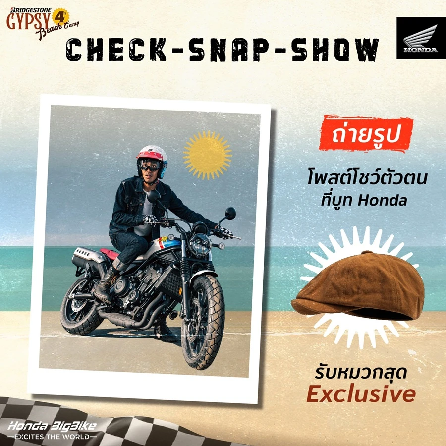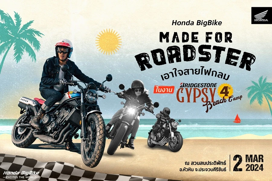 ฮอนด้าบิ๊กไบค์ เอาใจสายคลาสสิกขน จัดทริป Roadster Arcade 2024 ยกขบวนรถสาย Roadster ออกไปลุยบนเส้นทางกรุงเทพฯ - สวนสนประดิพัทธ์ (หัวหิน) มุ่งหน้าสู่งาน Bridgestone Gypsy Beach Camp ปีที่ 4 งานอีเวนต์ที่รวมเหล่าคอมมูนิตี้ไบค์เกอร์มากที่สุด พร้อมสัมผัสกิจกรรมสุดมันส์ กับการแข่งขันมอเตอร์ไซค์บนชายหาดแห่งปี Sand Speedway สนุกไปกับบรรยากาศชิลล์ๆ กับบูทฮอนด้าบิ๊กไบค์ที่ได้จัดเตรียมมอบความสนุกไว้ และปิดท้ายความมันส์ด้วยคอนเสิร์ตสุดคลู ในวันที่ 2-3 มีนาคม นี้ ณ สวนสนประดิพัทธ์ (หัวหิน)