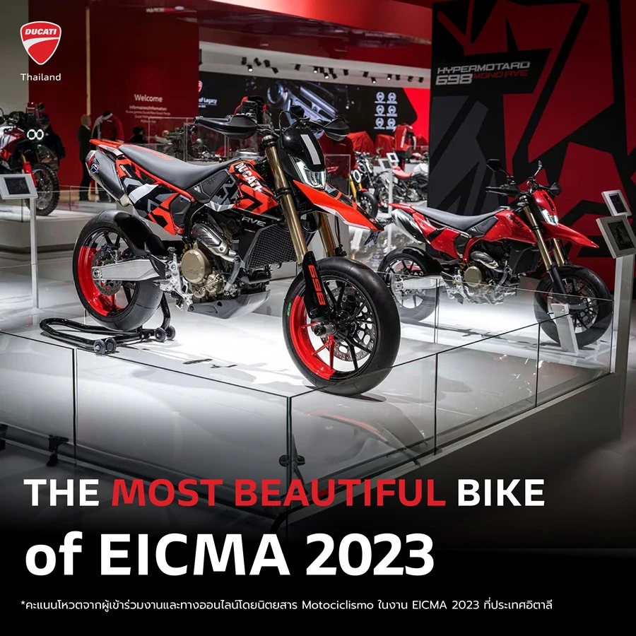 นาย ดอม เหตระกูล กรรมการผู้จัดการ บริษัท โมโตเร อิตาเลียโน จำกัด ผู้นำเข้าและจัดจำหน่าย ดูคาติ อย่างเป็นทางการ กล่าวว่า ดูคาติ ประเทศไทย ตอกย้ำความเป็นผู้นำตลาดบิ๊กไบค์ระดับไฮเอนด์ ด้วยการเปิดตัวรถรุ่นใหม่ในตระกูล Hypermotard 698 Mono ลงสนามพร้อมกันถึง 2 รุ่น ได้แก่ Hypermotard 698 Mono และ Hypermotard 698 Mono RVE สุดยอดดีไซน์รถบิ๊กไบค์ที่ได้รับการยอมรับในระดับโลก ด้วยการคว้ารางวัล The Most Beautiful Motorcycle (Moto più bella) มอเตอร์ไซค์ที่สวยที่สุดแห่งปีในงาน EICMA 2023 ซึ่งเป็นงานมหกรรมรถมอเตอร์ไซค์ที่ใหญ่ที่สุดในโลก จัดขึ้นในเมืองมิลาน ประเทศอิตาลี โดยนิตยสาร Motociclismo สิ่งพิมพ์เกี่ยวกับรถมอเตอร์ไซค์สัญชาติอิตาลีที่ดำเนินกิจการมาอย่างยาวนาน ได้ทำการสำรวจความคิดเห็นจากผู้เข้าร่วมงาน EICMA และผู้ลงคะแนนผ่านออนไลน์เกี่ยวกับรถมอเตอร์ไซค์ที่ชื่นชอบ ซึ่งผลโหวตออกมาเป็นเอกฉันท์ว่า Ducati Hypermotard 698 Mono RVE ถูกยกให้เป็นรถมอเตอร์ไซค์ที่สวยที่สุดในงาน EICMA 2023