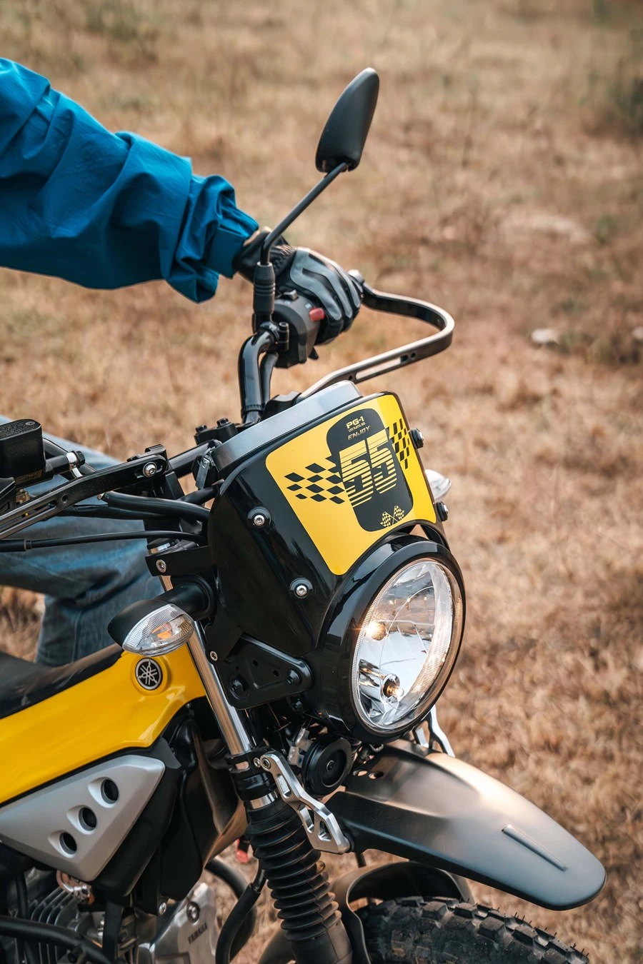 เริ่มจากด้านหน้าทำการติดตั้งชิลด์แต่งลายเบอร์ 55 พร้อมขายึด ชุดควบคุมเสริมการ์ดแฮนด์อะลูมิเนียมโดยมีขายึดเข้ากับแฮนด์บาร์ และอีกจุดยึดเข้ากับปลายแฮนด์ ทั้งด้านซ้าย-ขวา บังโคลนหน้ายกสูงขึ้นด้วยขายึดอะลูมิเนียม เข้ากับแกนโช้คหน้า