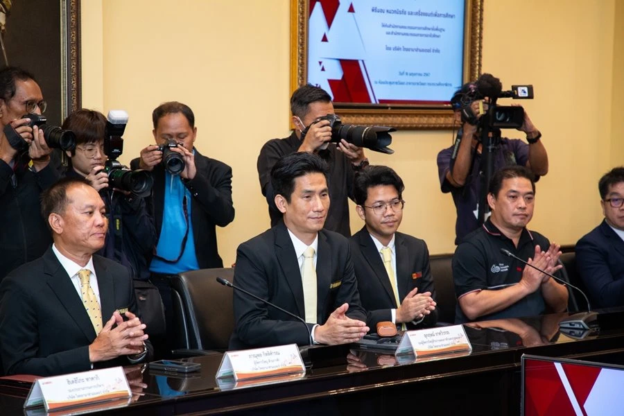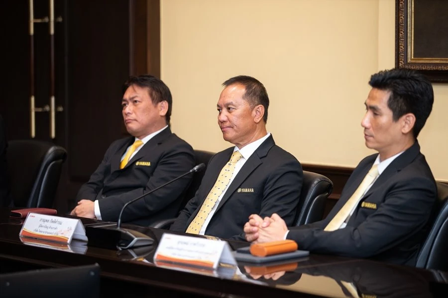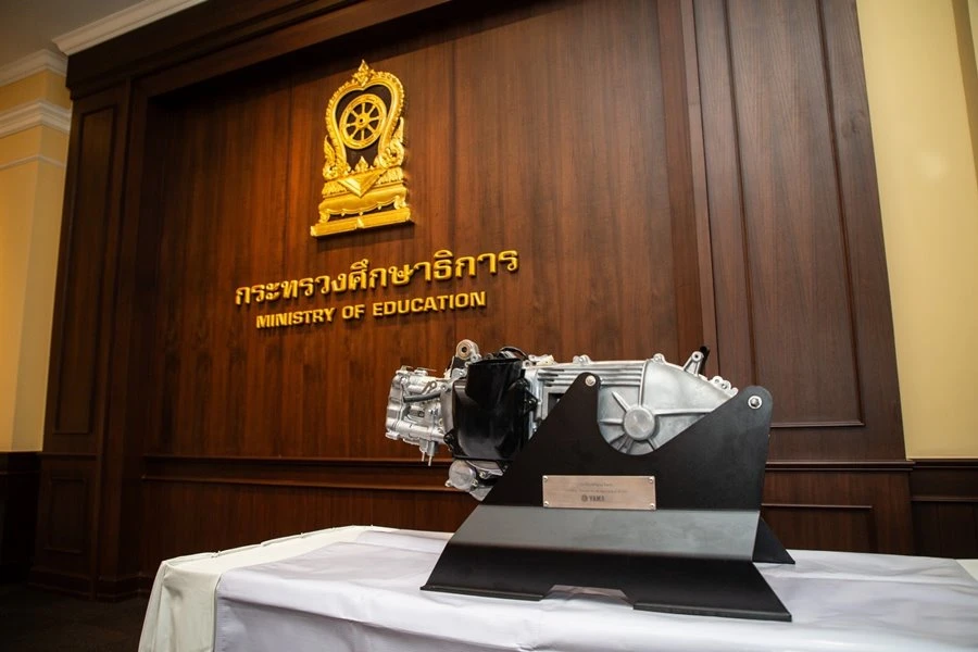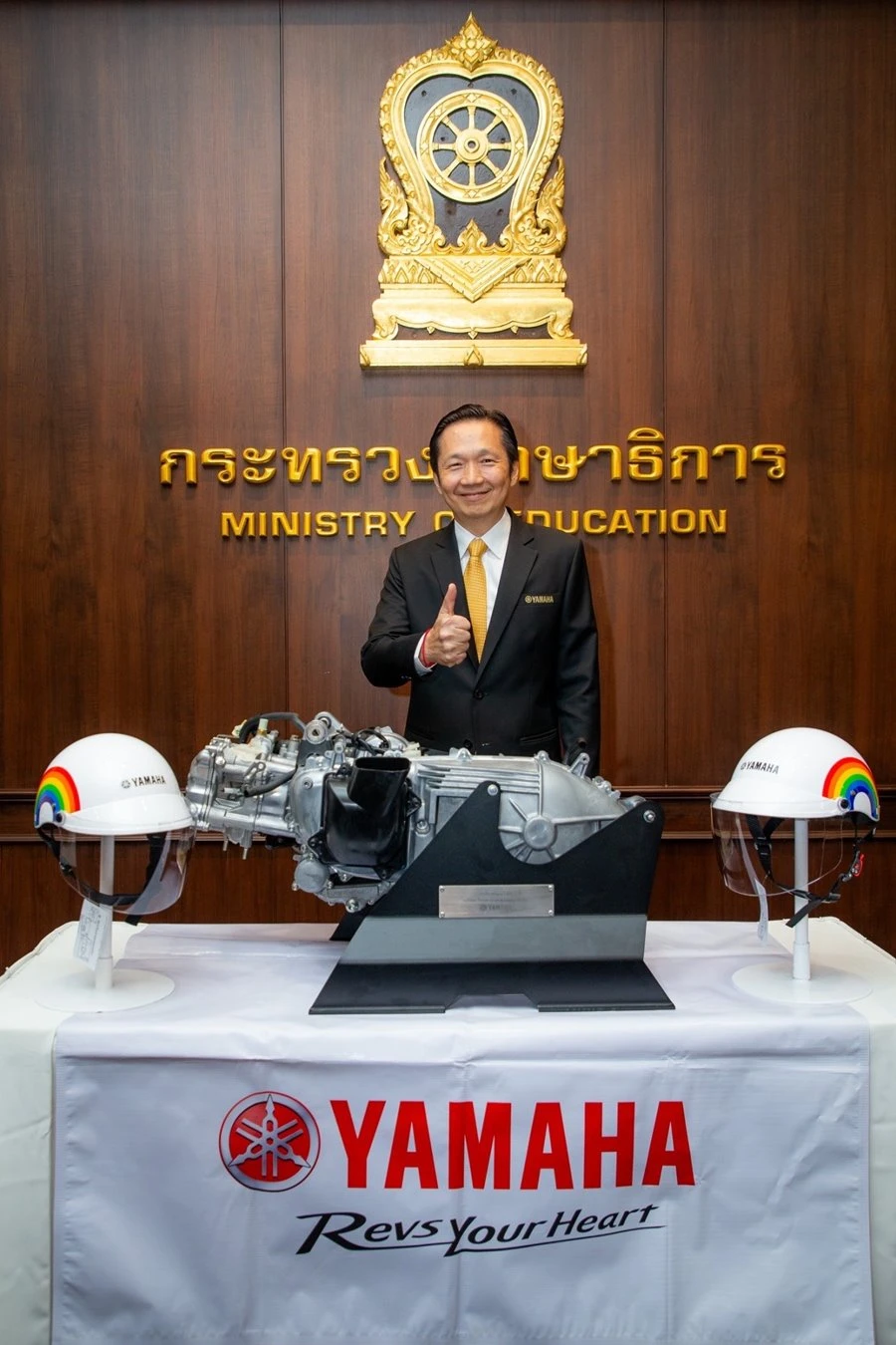 นายพงศธร เอื้อมงคลชัย ประธานกรรมการบริหาร, มร.ฮิเดฮิโกะ ทาคากิ รองประธานกรรมการบริหาร, นายภาณุพล กิตติคำรณ ผู้จัดการใหญ่ด้านการค้า, นายอุกฤษณ์ ภาควิวรรธ รองผู้จัดการใหญ่ด้านวางแผนการค้า และการตลาด บริษัท ไทยยามาฮ่ามอเตอร์ จำกัด ร่วมกันมอบหมวกนิรภัยขนาดเล็กที่ได้มาตรฐาน มอก. จำนวน 7,700 ใบ และเครื่องยนต์เพื่อการศึกษา ขนาด 300 ซีซี ระบบส่งกำลังด้วยระบบสายพาน จำนวน 100 เครื่อง ให้กับ พล.ต.อ.เพิ่มพูน ชิดชอบ รัฐมนตรีว่าการกระทรวงศึกษาธิการ, ว่าที่ ร.ต.ธนุ วงษ์จินดา เลขาธิการคณะกรรมการการศึกษาขั้นพื้นฐาน และนายยศพล เวณุโกเศศ เลขาธิการคณะกรรมการการอาชีวศึกษา ร่วมกันรับมอบ