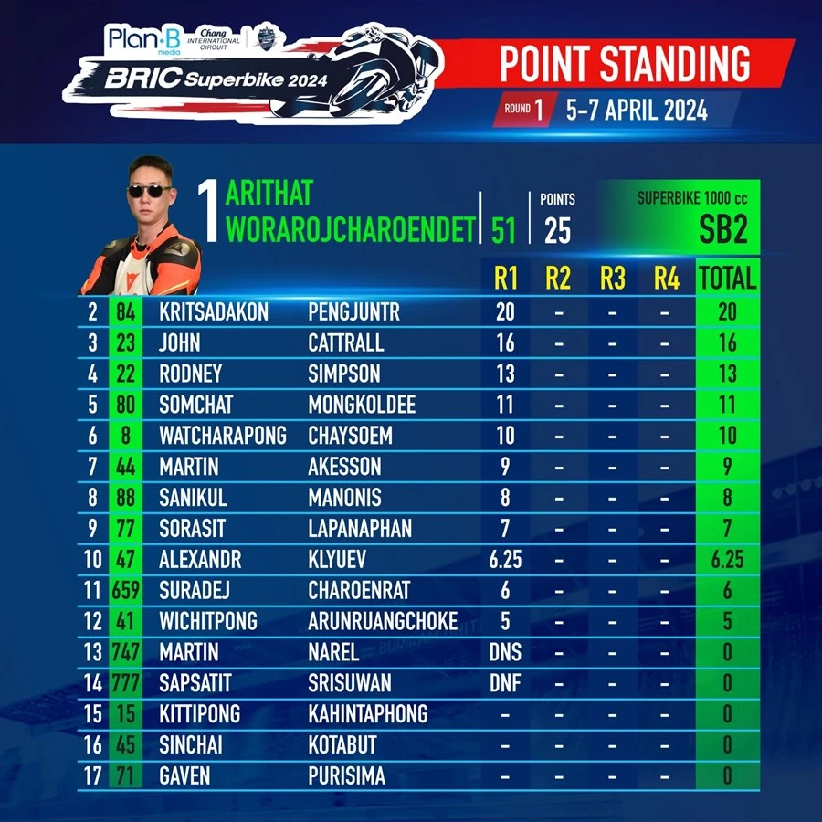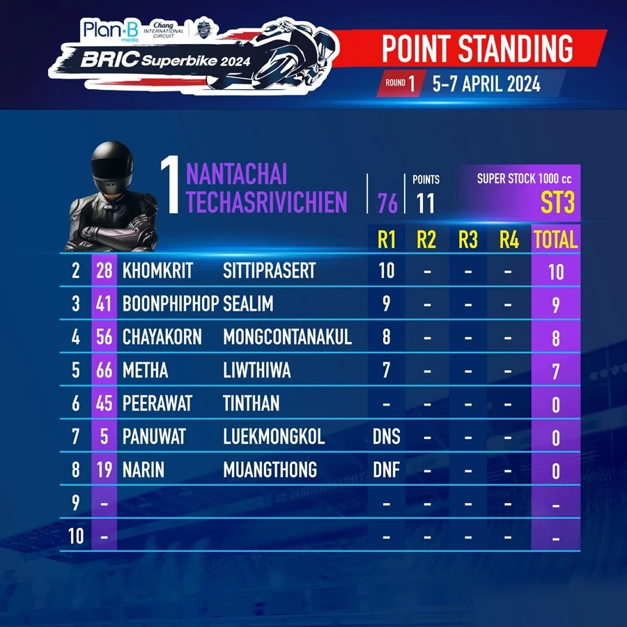 ทั้งนี้ ศึก แพลน บี มีเดีย บีอาร์ไอซี ซูเปอร์ไบค์ แชมปี้ยนชิพ 2024 สนามที่ 2 มีคิวจับเวลารอบควอลิฟายเพื่อจัดอันดับสตาร์ตในวันเสาร์ที่ 1 มิถุนายน ก่อนจะดวลความเร็วรอบชิงชนะเลิศในวันอาทิตย์ที่ 2 มิถุนายน 2567