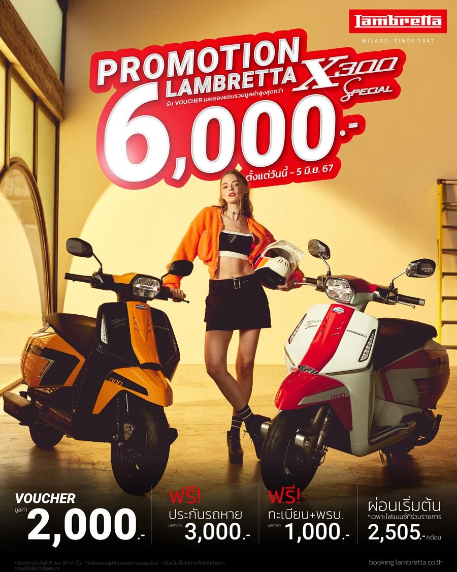เพียงจองรถรุ่น LAMBRETTA X300 Special ผ่านช่องทางออนไลน์ เว็บไซต์ https://booking.lambretta.co.th ตั้งแต่วันนี้ - 5 มิ.ย. 67 ก็รับข้อเสนอสุดพิเศษ! รวมมูลค่ากว่า 6,000 บาท (Voucher มูลค่า 2,000 บาท , ฟรี! ทะเบียนและพรบ. มูลค่า 1,000 บาท, ฟรี! ประกันรถหาย มูลค่า 3,000 บาท) สามารถดูรายละเอียดเพิ่มเติมได้ที่
