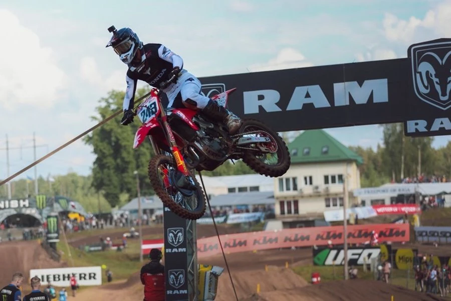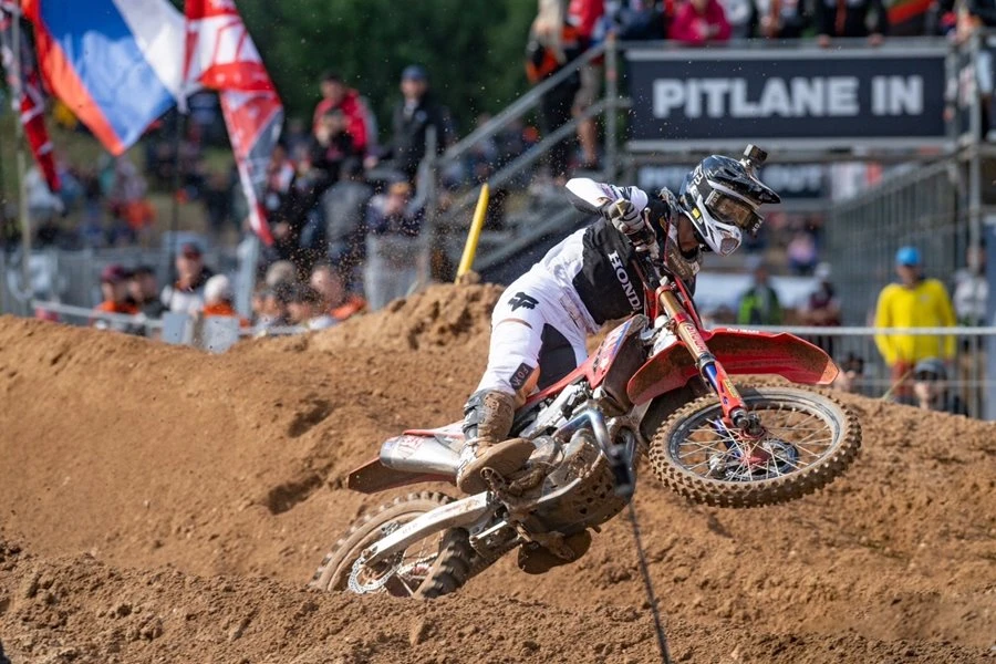 ศึก MXGP 2024 สนามที่ 9 รายการ MXGP of Latvia ในเรซที่ 1 ทิม ไกเซอร์ ควง Honda CRF450R หมายเลข 243 บิดต่อสู้กับสภาพสนามที่ลื่นเป็นอย่างมากและโคลนในโค้งจากสายฝนที่ตกลงมาก่อนการแข่งขัน ซึ่งแม้จะพลาดคว้าโฮลช็อต ยังคงผลงานเข้าเส้นชัยได้ในอันดับที่ 2