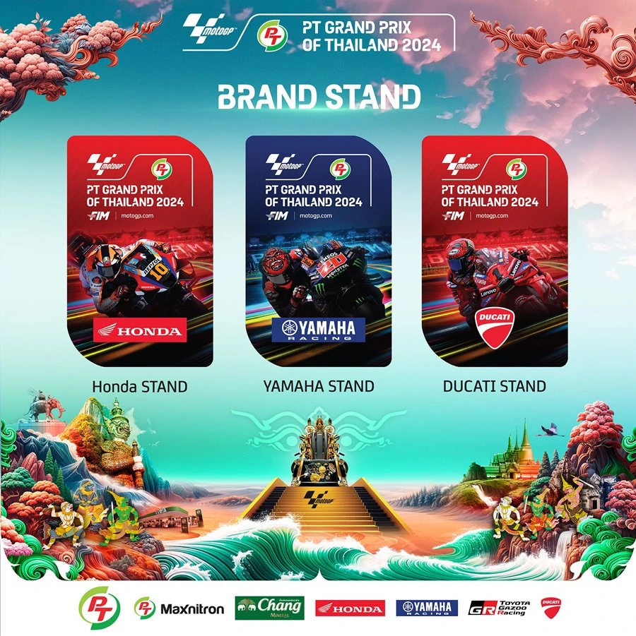ส่วน แบรนด์ สแตนด์ สำหรับกองเชียร์จากค่ายรถจักรยานยนต์ชั้นนำ ชูความแข็งแกร่งของนักบิดซูเปอร์สตาร์โมโตจีพีของแต่ละค่าย ได้แก่ บัตรดูคาติ สแตนด์เป็นภาพรถแข่งหมายเลข 1 ฟรานเชสโก้ บันยาญ่า, ยามาฮ่า สแตนด์ ภาพ ฟาบิโอ กวาร์ตาราโร รถหมายเลข 20 ส่วนบัตรฮอนด้า สแตนด์ เป็นภาพ ลูก้า มารินี่”กับรถหมายเลข 10