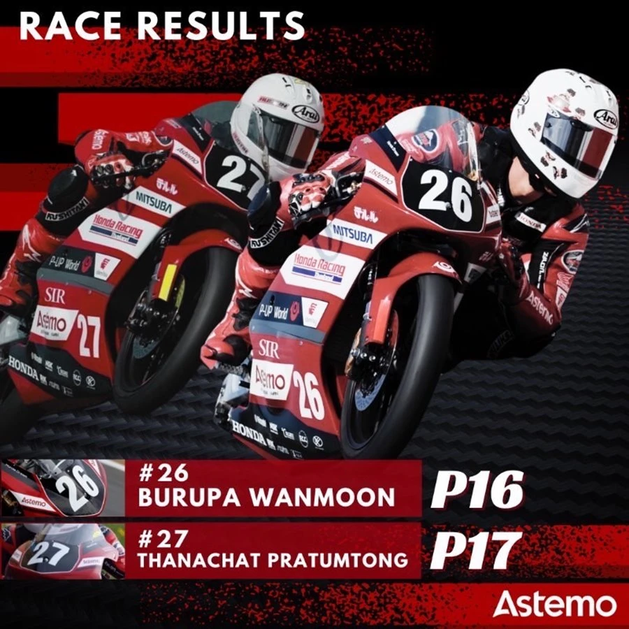 ผลการแข่งขัน จิมมี่-บูรพา วันมูล หมายเลข 26 ออกสตาร์ตจากกริดที่ 16 ต่อสู้กับคู่แข่งเจ้าถิ่นที่มากประสบการณ์กว่า จบการแข่งขันในอันดับที่ 16 ขณะที่ทีมเมท ออสติน-ธนฉรรต ประทุมทอง หมายเลข 27 ลงแข่งขันสนามนี้เป็นครั้งแรก และโชว์ทักษะได้อย่างยอดเยี่ยม ออกสตาร์ตจากกริดที่ 21 สามารถขยับอันดับขึ้นเข้าเส้นชัยในอันดับที่ 17
