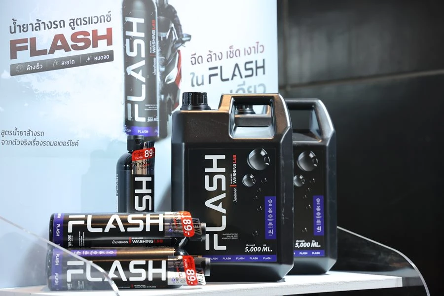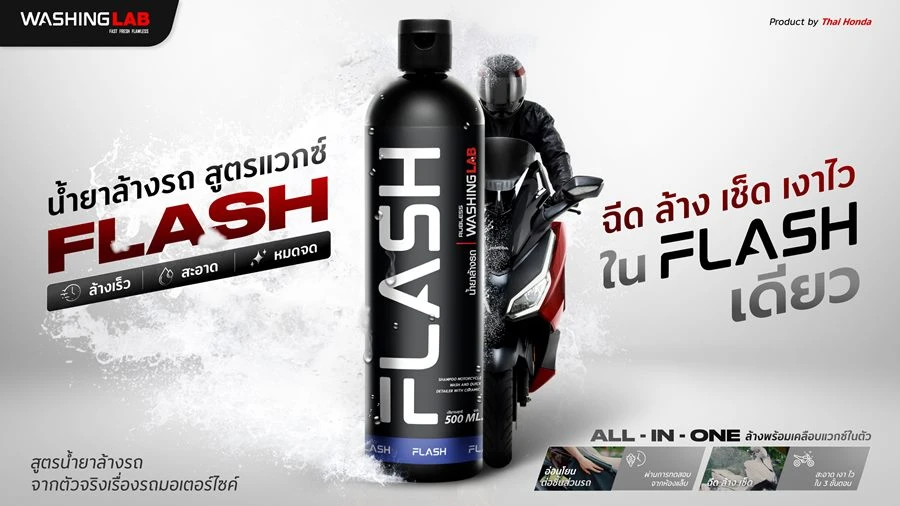 ไทยฮอนด้า ได้เปิดตัวผลิตภัณฑ์น้ำยาล้างรถ Flash จาก Washing LAB เพื่อตอบโจทย์การดูแลรถให้สวยเงางาม พร้อมขับขี่อย่างมั่นใจช่วงหน้าฝน ทั้งนี้ Flash เป็นน้ำยาล้างรถสูตรผสมแวกซ์ที่พัฒนาขึ้นโดยผู้เชี่ยวชาญเรื่องรถจักรยานยนต์ตัวจริง คิดค้นสูตรที่ตอบโจทย์เสียงลูกค้าผู้ใช้งานจริงในชีวิตประจำวัน อ่อนโยนต่อชิ้นส่วนรถทั้งสีเงา และสีด้าน รวมถึงช่วยขจัดคราบน้ำมันสิ่งสกปรกต่างๆ ได้ง่ายและรวดเร็ว