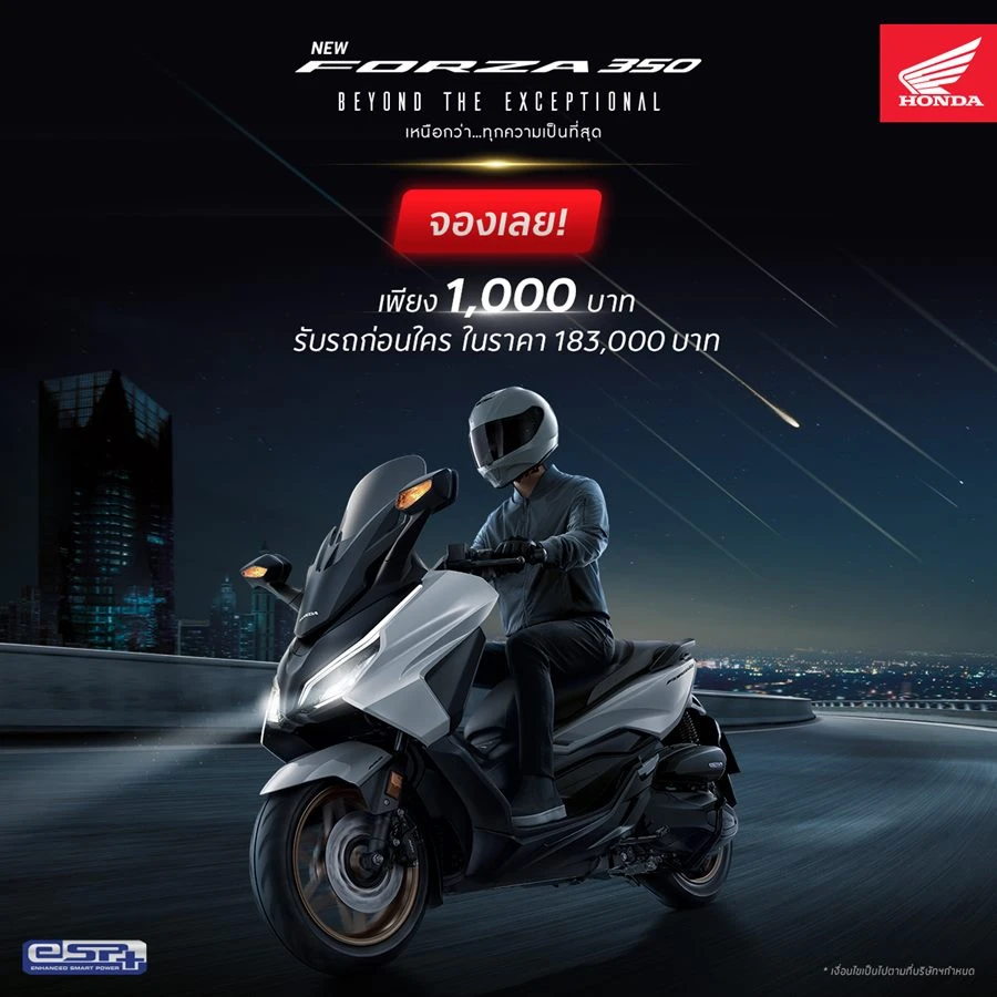 รถจักรยานยนต์ฮอนด้า พร้อมให้เป็นเจ้าของ New Honda FORZA350 รุ่น RoadSync อย่างเป็นทางการ มีวางจำหน่ายทั้งหมด 4 เฉดสี ได้แก่ สีแดง-ดำ ใหม่ SUNSTORM RED, สีขาว-ดำ ใหม่ STELLAR WHITE, สีเทา-ดำ METEOR GRAY และ สีดำ COSMIC BLACK ราคาแนะนำ 183,000 บาท โดยผ่อนเริ่มต้น 3,810 บาทต่อเดือน ด้วยดอกเบี้ย 4.99% เปิดจองออนไลน์ได้แล้ววันนี้เพียง 1,000 บาท ตั้งแต่วันนี้ ถึง 30 กันยายน 2567 หรือชมรถคันจริงได้ที่ศูนย์ Honda Wing Center ทั่วประเทศ