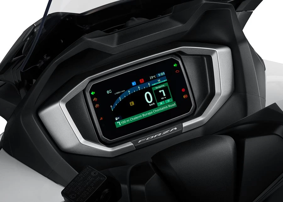 New Honda FORZA350 มาพร้อมเทคโนโลยีเหนือระดับกับเทคโนโลยีหน้าจอแสดงผล TFT ใหม่ ขนาด 5 นิ้ว แสดงผลทุกข้อมูลการขับขี่ได้ครบถ้วนชัดเจน รวมถึงการแสดงผลระบบ HSTC (Honda Selectable Torque Control) ระบบตรวจจับและควบคุมล้อหน้า-ล้อหลังให้สัมพันธ์กัน ป้องกันรถเสียการทรงตัว เพื่อความปลอดภัยในทุกการขับขี่