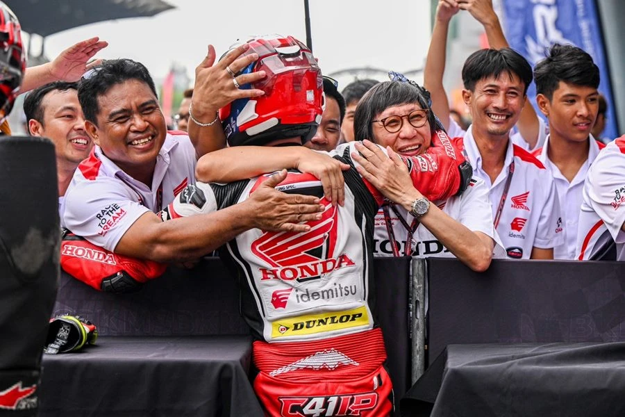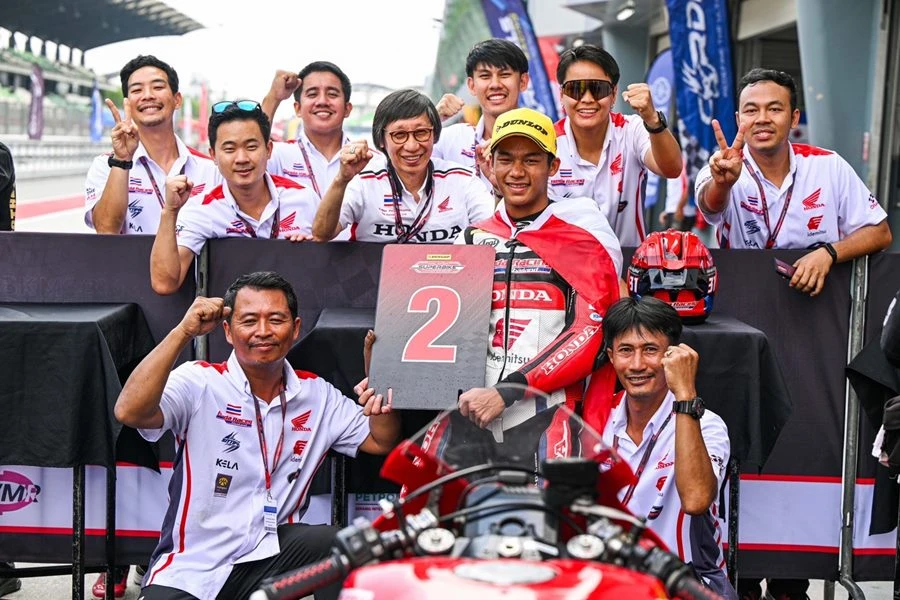 ขยับเข้าสู่เรซที่ 2 ในวันอาทิตย์ สำหรับรุ่น MSBK 250 ไฮเปค-กฤษฎา ยังคงเดินหน้าสร้างผลงานร้อนแรงอย่างต่อเนื่อง เริ่มเกมจากกริดที่ 6 ออกตัวอย่างยอดเยี่ยม ไล่บดกับคู่แข่งเพื่อลุ้นชัยชนะถึงโค้งสุดท้าย ก่อนบิดเข้าป้ายในอันดับ 2 ด้วยเวลา 19 นาที 55.931 วินาที ฉลองโพเดียม 2 เรซติดต่อกัน ส่วนทีมเมทอย่าง อุ้ม-นพรุธพงษ์ หมายเลข 8 เข้าป้ายในอันดับ 7 จากผลงานร้อนแรงคว้า 2 โพเดียมในสุดสัปดาห์นี้ ส่งผลให้ ไฮเปค-กฤษฎา ทะยานขึ้นมารั้งท็อป 7 บนตารางคะแนนสะสม มีทั้งสิ้น 36 คะแนน แม้จะไม่ได้ลงแข่งสนามแรกก็ตาม ส่วน อุ้ม-นพรุธพงษ์ เก็บคะแนนได้ทั้ง 2 เรซ