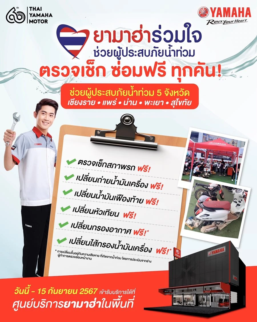บริษัท ไทยยามาฮ่ามอเตอร์ จำกัด ร่วมกับ ผู้จำหน่ายรถจักรยานยนต์ยามาฮ่า 5 จังหวัดภาคเหนือ ได้แก่ จังหวัดเชียงราย, แพร่, น่าน, พะเยา และ สุโขทัย ร่วมใจช่วยเหลือผู้ประสบอุทกภัย จัดฟรี! บริการพิเศษตรวจเช็กสภาพรถจักรยานยนต์ยามาฮ่า และบริการเปลี่ยนอะไหล่ 5 รายการ ได้แก่