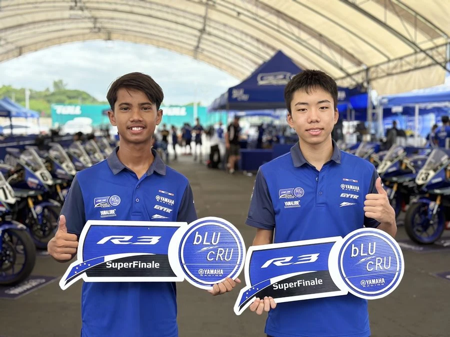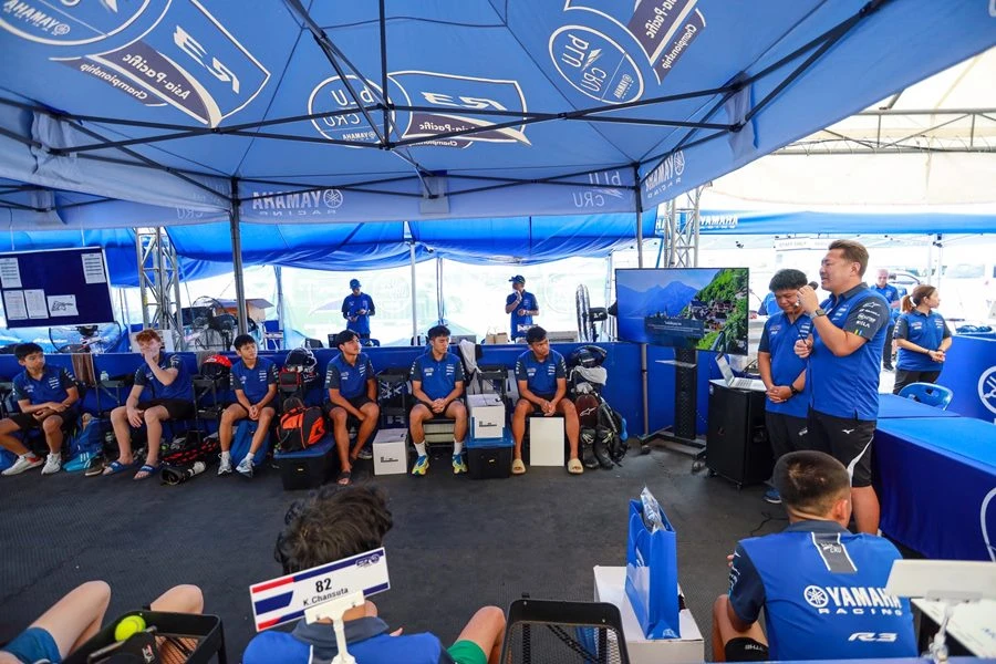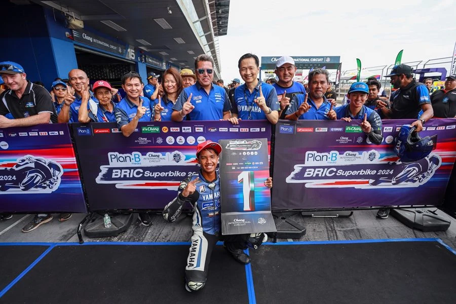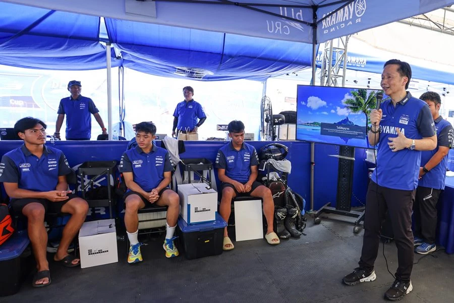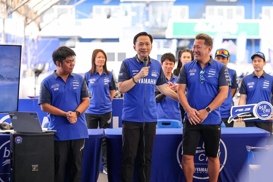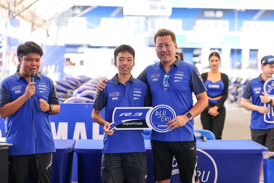 นายพงศธร เอื้อมงคลชัย ประธานกรรมการบริหาร บริษัท ไทยยามาฮ่ามอเตอร์ จำกัด มอบรางวัลไวลด์การ์ดเข้าร่วมการแข่งขัน YAMAHA R3 bLU cRU Super Finale ให้กับ เชลล์-ศักดิ์ชัย คงดวงดี ดาวรุ่งนักบิดวัย 14 และ คาเครุ โอกุนุกิ นักบิดแดนปลาดิบ และร่วมถ่ายภาพพร้อมกับขุนพลนักบิดในรายการ YAMAHA R3 bLU cRU Asia-Pacific 2024