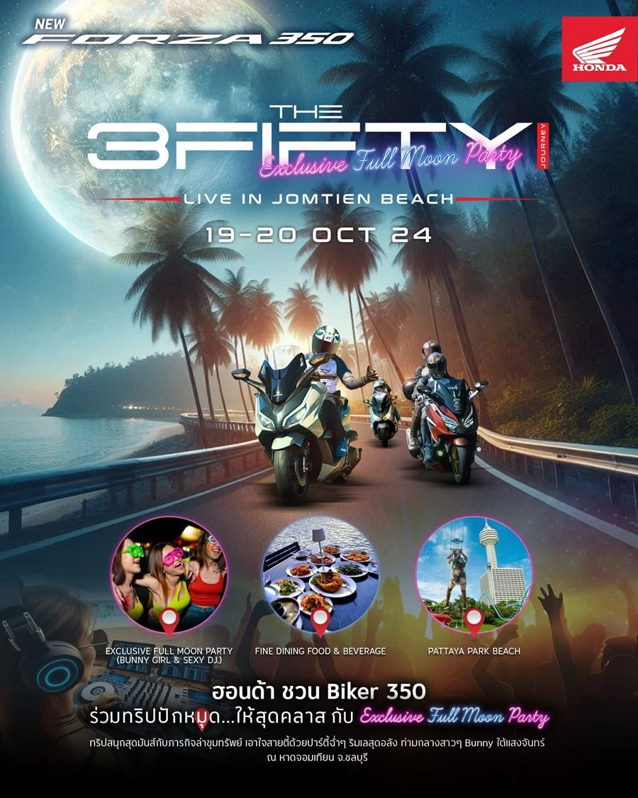 ไทยฮอนด้า เตรียมจัดกิจกรรม The 3Fifty Journey Exclusive Full Moon Party ชวนชาว New Honda Forza350 มาขับขี่บนเส้นทางสุดชิลริมทะเล และแวะท่องเที่ยวเมืองชลบุรี มันส์ไปกับกิจกรรมสุดผาดโผน พร้อมปาร์ตี้ริมหาดในคืนพระจันทร์เต็มดวง ดื่มด่ำกับบรรยากาศ พร้อมมื้ออาหารสุดพิเศษตลอดทริป ณ ชายหาดจอมเทียน พัทยา จ.ชลบุรี ตลอดระยะเวลา 2 วัน 1 คืน ในวันที่ 19 - 20 ตุลาคมนี้
