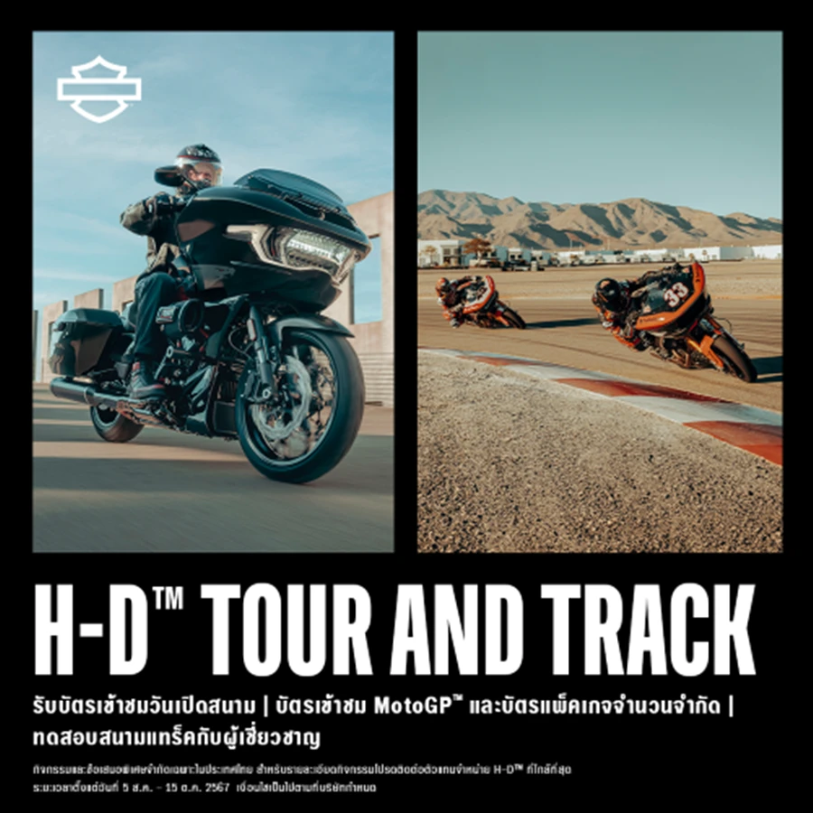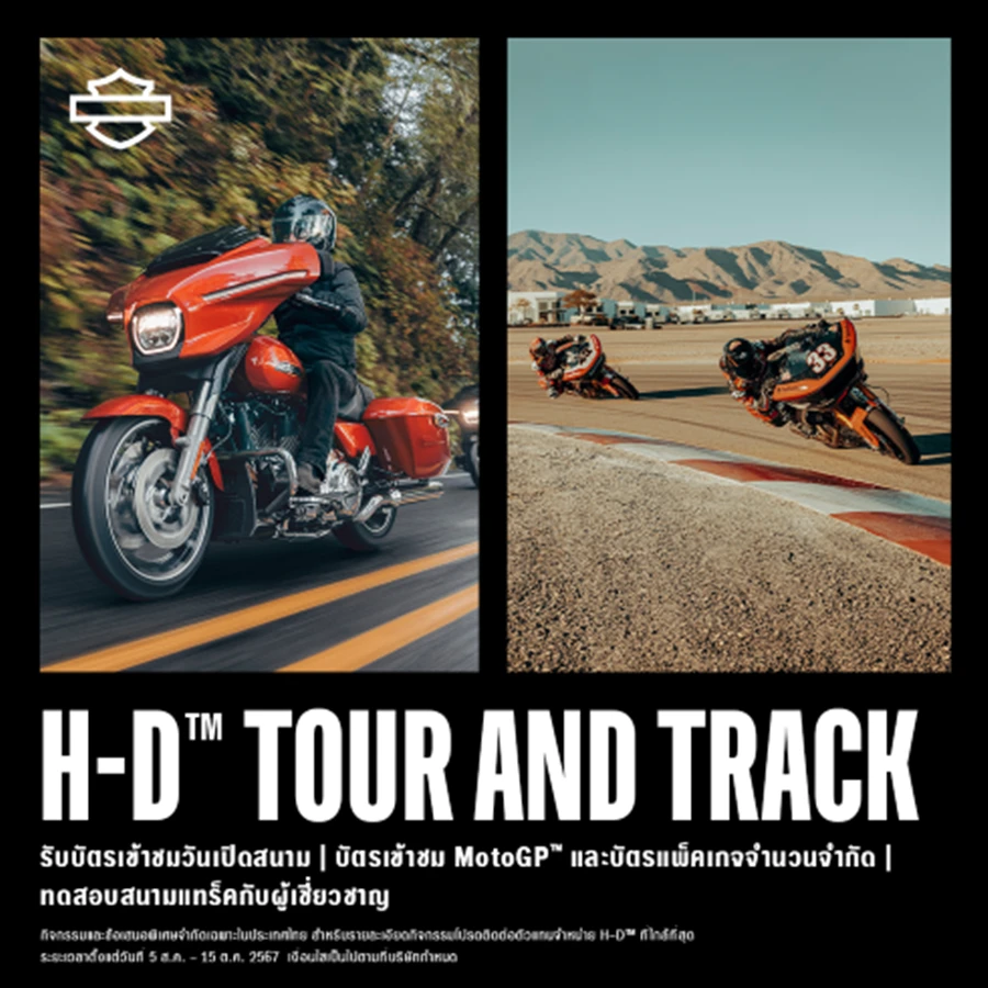 สำหรับลูกค้าที่ซื้อรถมอเตอร์ไซค์ Harley-Davidson ตระกูล Grand American Touring ในช่วงแคมเปญ Tour and Track จะได้รับสิทธิ์เข้าร่วมกิจกรรม Open Track Days จำนวน 10 ครั้ง ตั้งแต่วันนี้จนถึงวันที่ 31 ธันวาคม 2567 ณ สนามไทยแลนด์เซอร์กิต อำเภอนครชัยศรี จังหวัดนครปฐม โดยผู้มีสิทธิ์ร่วมกิจกรรมสามารถนำรถมอเตอร์ไซค์ Harley-Davidson ตระกูล Touring ของตนเองมาร่วมกิจกรรม หรือ ใช้รถมอเตอร์ไซค์ตระกูล Touring ที่จัดเตรียมไว้ให้ในภายในงาน โดยจะมีผู้ฝึกสอนให้คำแนะนำสำหรับ Open Track Days 2 ครั้งแรก กิจกรรม Open Track Days จะจัดเฉพาะวันเสาร์ ในช่วงเวลาที่สนามแข่งเปิดเท่านั้น