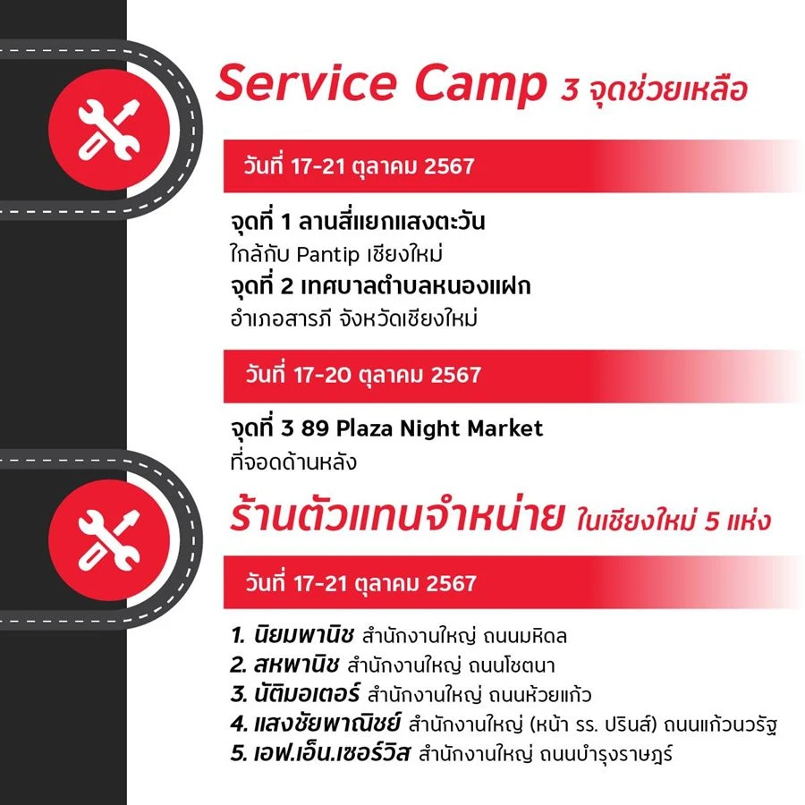 ส่วนร้านตัวแทนจำหน่ายทั้ง 5 แห่งในจังหวัดเชียงใหม่ สามารถนำรถจักรยานยนต์เข้ารับบริการซ่อมบำรุง โดยเปิดรับบัตรคิวระหว่างเวลา 09.00 – 16.00 น.