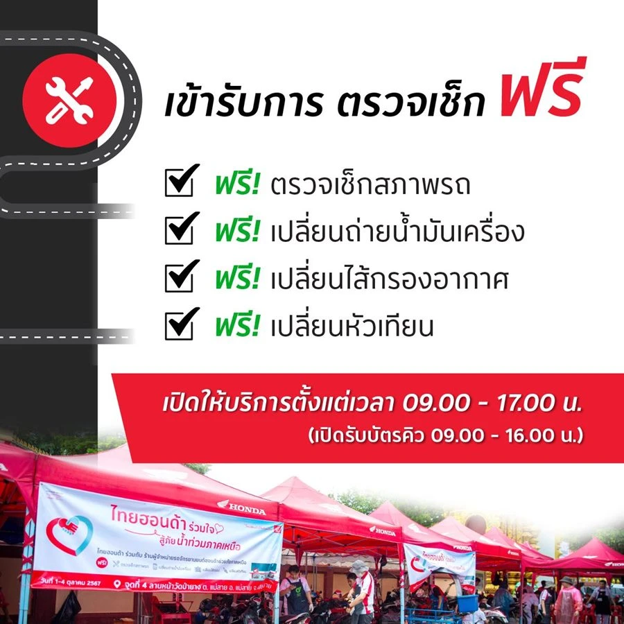 ไทยฮอนด้าร่วมใจ สู้ภัยน้ำท่วม ยกทีมช่างผู้เชี่ยวชาญไปช่วยเหลือผู้ใช้งานรถจักรยานยนต์ฮอนด้าที่ประสบอุทกภัย จังหวัดเชียงใหม่ โดยการเปิดให้บริการตรวจเช็กสภาพรถ ซ่อมแซมฟรีทั้งหมด 4 รายการ พร้อมอำนวยความสะดวกให้กับผู้ใช้งานเปิดบริการซ่อมทั้งหมด 3 จุด ตั้งแต่วันที่ 17 – 21 ตุลาคม 2567 นี้