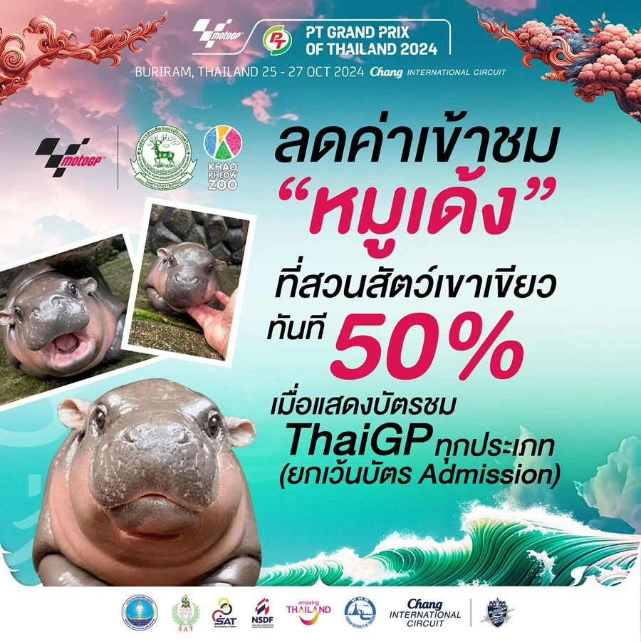 หมูเด้งรันทุกวงการ ล่าสุด โมโตจีพี สนามประเทศไทย หรือ ThaiGP สร้างตำนานบทใหม่ จับมือ สวนสัตว์เปิดเขาเขียว องค์การสวนสัตว์แห่งประเทศไทย คอลแลบ (Collab) หมูเด้ง ซูเปอร์สตาร์ตัวกลม สู่ศึกกรังด์ปรีซ์ที่เร็วและแรงที่สุดในโลก ที่กำลังจะระเบิดศึกบนผืนแผ่นดินไทย จัดแคมเปญเอาใจแฟนความเร็วทั่วโลกที่มีใจรัก ลูกฮิปโปโปเตมัสแคระสุดน่ารัก เจ้าของมีมเกรี้ยวกราดแห่งปี โดยผู้ที่มีบัตรโมโตจีพี เตรียมลุ้นสิทธิ์ 2 เด้ง แบบลิมิเต็ด สนามเดียวในโลก