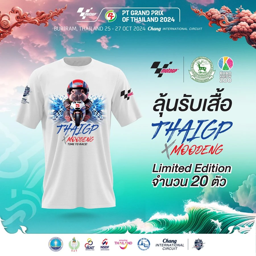 เด้งที่ 2 ลุ้นรับเสื้อ MOODENG Limited Edition พิเศษ สำหรับแฟนๆโมโตจีพี เพียง 20 ตัว ในโลกเท่านั้น! ตัวเสื้อเป็นสีขาว เนื้อผ้าสวมใส่สบาย ด้านหน้าเป็นมีมใหม่สุดคิ้วท์