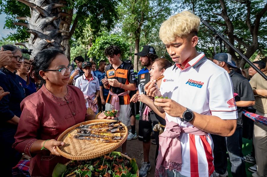 นอกจากนี้ยังมีการคัดสรรเมนู เชิดชูอาหารท้องถิ่น บางเมนูหารับประทานยากและอาจเลือนหายไปตามกาลเวลา ได้แก่ ขนมตดหมา หรือ ภาษาถิ่นเรียกว่า เวือระพอม ที่มีส่วนผสมของน้ำจากเครือ ต้นตดหมา พืชสมุนไพรพื้นบ้านสรรพคุณหลายอย่าง เป็นยาอายุวัฒนะ รักษาโรคได้หลายชนิด เนื้อสัมผัสขนมนุ่มหนึบ หอมอร่อยลักษณะคล้ายกับขนมจาก, ทองม้วนสดข้าวนกกระเรียน ที่ทำจากข้าวหอมมะลิอินทรีย์พื้นเมืองที่ปลูกในแหล่งอยู่อาศัยของนกกระเรียนพันธุ์ไทยหายาก โดยสร้างนิเวศน์ให้เป็นแหล่งอาหาร ปลูกโดยไม่ใช้สารเคมี ยาฆ่าแมลง รวมทั้งเมนู กระยาสารท ขนมโบราณ ของฝากขึ้นชื่อของถิ่นอีสานใต้ให้นักบิดได้ลองลิ้มชิมรส