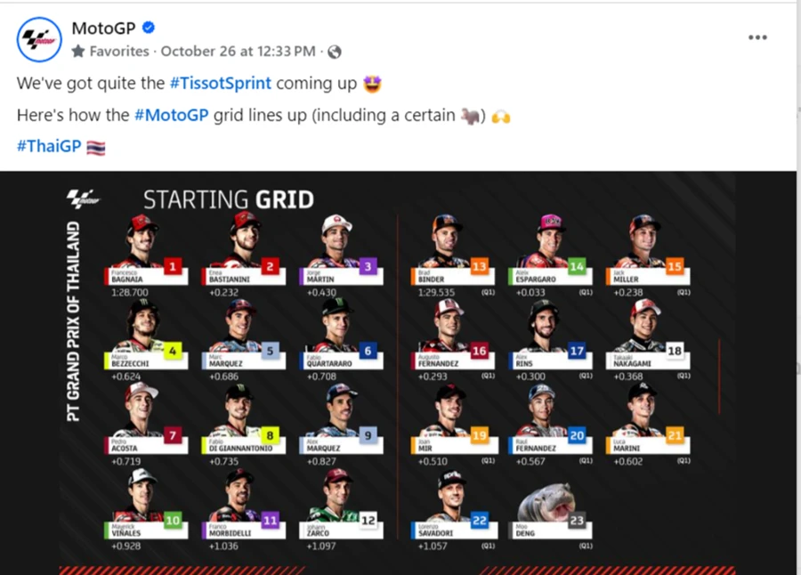 ไฮไลต์สำคัญที่สร้างสีสัน ไวรัลอีกครั้งกับ หมูเด้ง ที่เพจหลัก Motogp.com เผยภาพ หมูเด้ง ออกสตาร์ตในกริดสุดท้ายของรุ่น MotoGP ลำดับที่ 23 โดยไม่ต้องผ่านรอบควอลิฟาย ถูกกล่าวขานและแชร์ออกไปทั่วโลก เหล่าแฟนคลับชูป้ายเชียร์หมูเด้งในสนาม