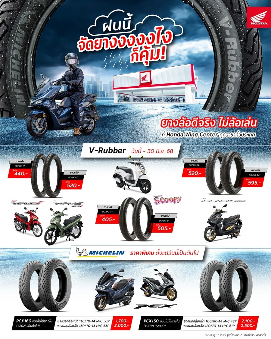 ทั้งนี้ ราคาพิเศษดังกล่าวเฉพาะรุ่นที่บริษัทฯ กำหนด และไม่รวมค่าบริการติดตั้ง ลูกค้าสามารถรับสิทธิ์โปรโมชั่นสุดคุ้มนี้ได้ที่ร้านผู้จำหน่ายฮอนด้าทั่วประเทศ พร้อมย้ำเตือนผู้ขับขี่ให้เตรียมพร้อมสำหรับการเดินทางช่วงหน้าฝนด้วยยางล้อคุณภาพ เพื่อความปลอดภัยสูงสุดในทุกเส้นทาง