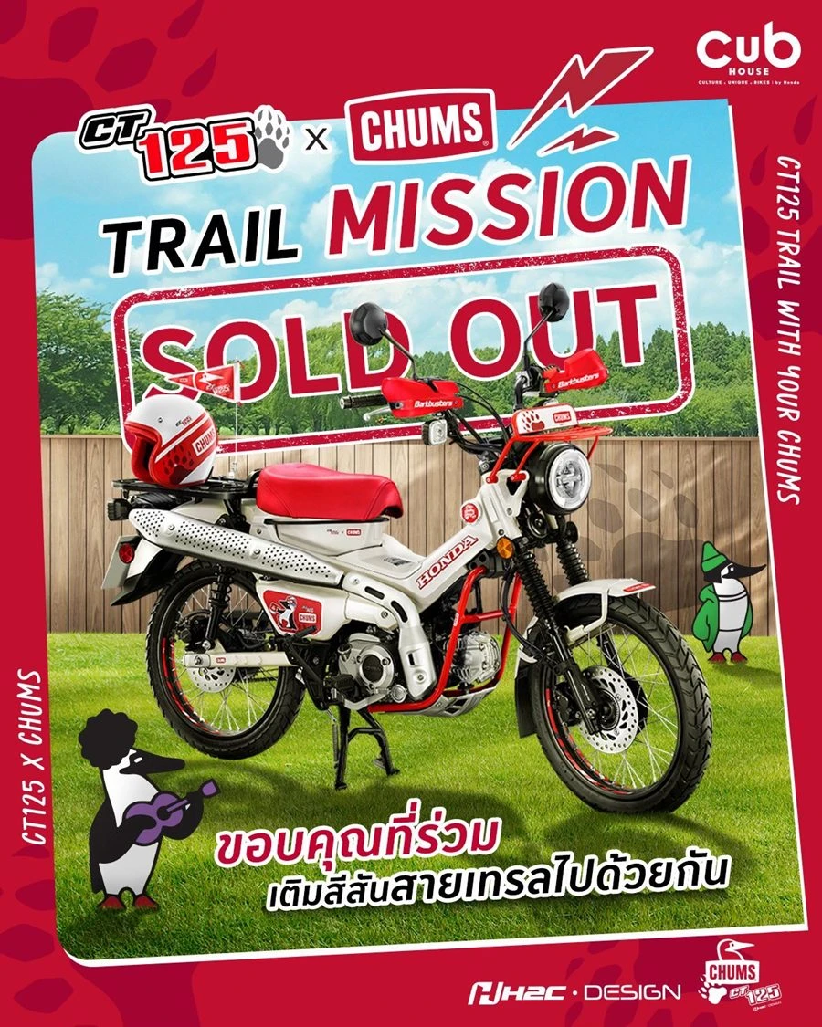 รวมถึงเป็นการโคจรมาพบกับ CHUMS แบรนด์แฟชั่นเอาท์ดอร์สุดชิคจากประเทศญี่ปุ่นเป็นครั้งแรก ทำให้ได้รับกระแสตอบรับถล่มทลาย โดยสามารถปิดการขายได้ครบจำนวนจำกัด 300 คัน ภายในเวลาเพียง 10 วัน สะท้อนให้เห็นถึงความนิยมและความต้องการของลูกค้าที่หลงใหลในรถสไตล์เทรลลุคใหม่ ทั้งนี้ ไทยฮอนด้าขอขอบคุณลูกค้าทุกท่านที่ให้ความไว้วางใจและเชื่อมั่นในแบรนด์ ความสำเร็จในครั้งนี้ถือเป็นอีกก้าวสำคัญที่สะท้อนถึงความแข็งแกร่งของไทยฮอนด้า และตอกย้ำความเป็นผู้นำตลาดรถจักรยานยนต์ไทย