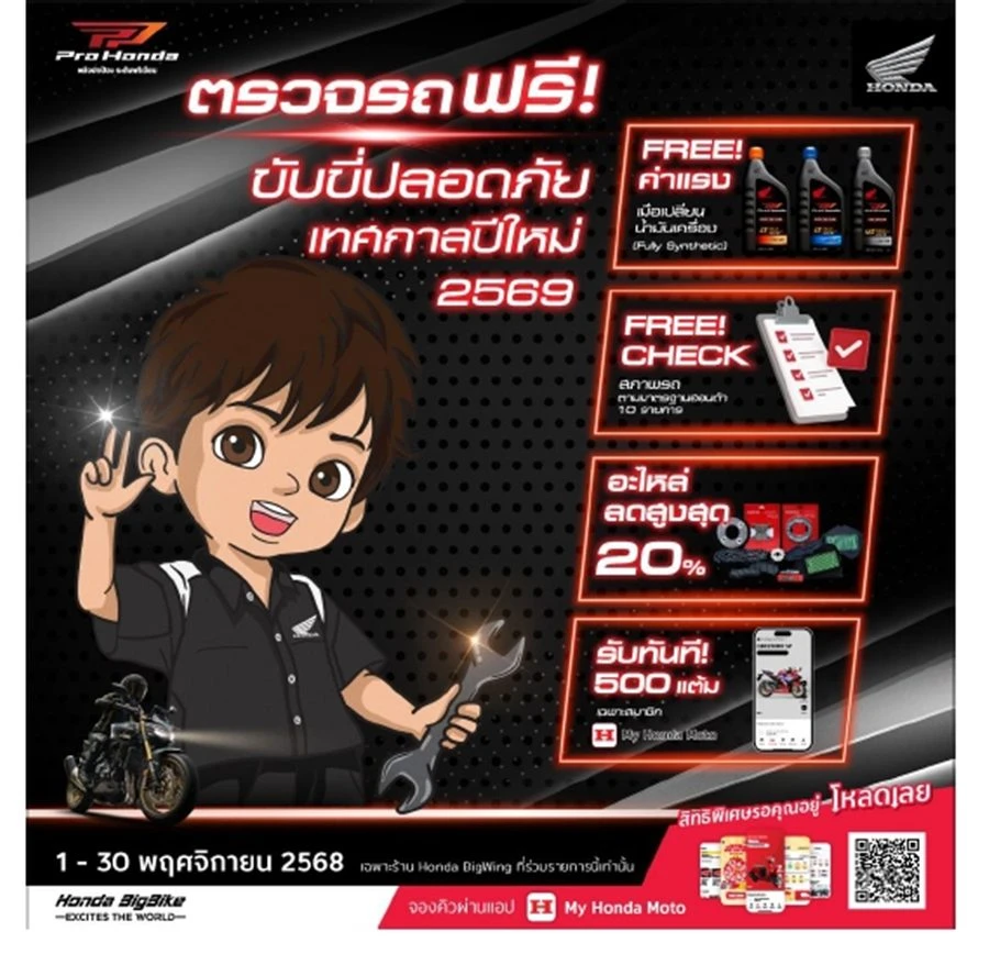ฮอนด้าก่อนออกเดินทางในช่วงเทศกาลปีใหม่ 2569 พร้อมรับสิทธิพิเศษอื่น ๆ ได้ที่ Honda BigWing ทั่วประเทศ (เฉพาะร้านที่ร่วมรายการ) ตั้งแต่วันที่ 1 – 30 พฤศจิกายน 2568