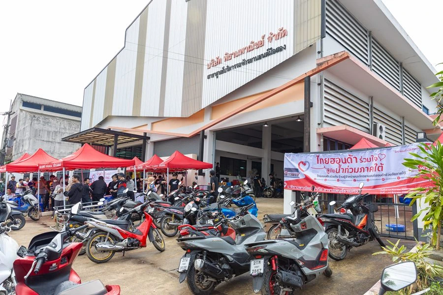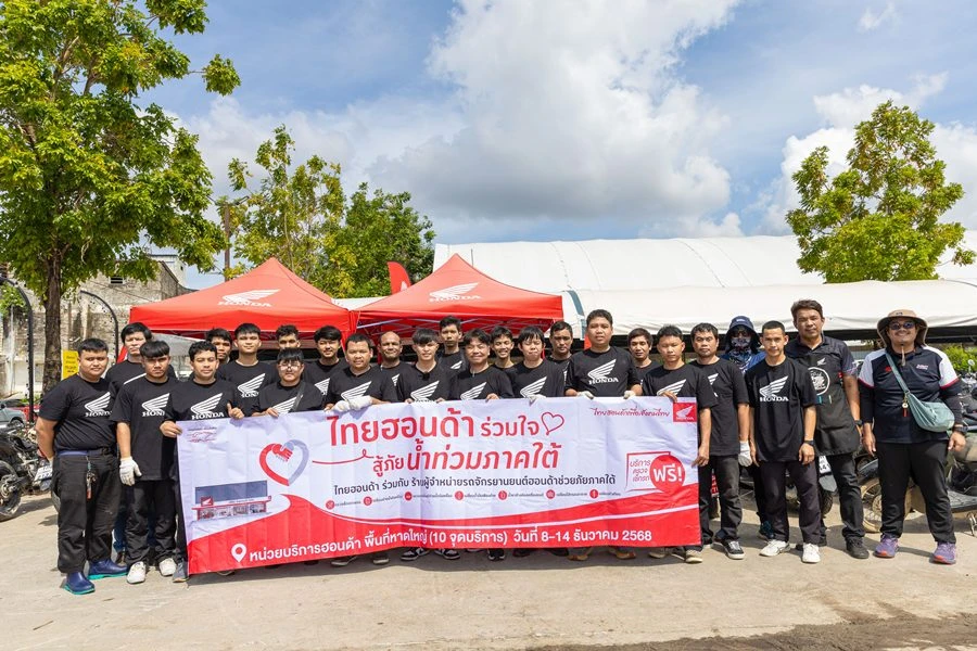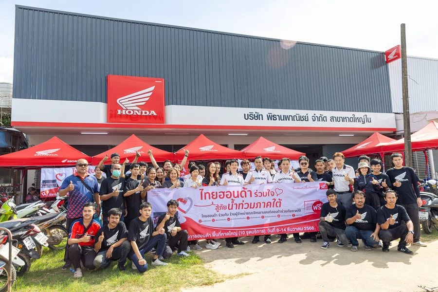 ไทยฮอนด้า ร่วมกับร้านผู้จำหน่ายรถจักรยานยนต์ฮอนด้าทั่วประเทศ เดินหน้าเช่วยเหลือผู้ประสบภัยภาคใต้ภายใต้โครงการ ไทยฮอนด้า ร่วมใจสู้ภัยน้ำท่วมภาคใต้ โดยส่งทีมช่างมืออาชีพ และอาสาสมัครช่างศูนย์บริการฮอนด้าจากทั่วประเทศกว่า 200 คน พร้อมอุปกรณ์ช่างครบชุด บินตรงลงพื้นที่หาดใหญ่เพื่อให้บริการตรวจเช็กและซ่อมรถที่ได้รับผลกระทบจากน้ำท่วมอย่างเร่งด่วน หลังมีประชาชนนำรถเข้ารับบริการมากกว่า 1,000 คัน ภายในวันแรก