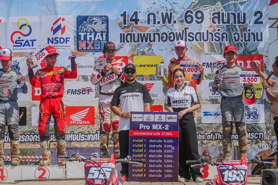ขณะที่การแข่งขันในรุ่น MX-2 Pro คิ้วท์-พันธกานต์ บุญชาลี หมายเลข 17  บิดยอดรถแข่ง Honda CRF250R ทีม Honda Asia Bowin Idemitsu S Motor ระเบิดผลงานคว้าอันดับที่ 2 มาครอง โดยมี ไตรตั้น-เตโชดม มีแสง หมายเลข 193 จากทีม Honda Racing Thailand Idemitsu Wannalak Motorsport ตามมาในอันดับที่ 3 บนโพเดียม