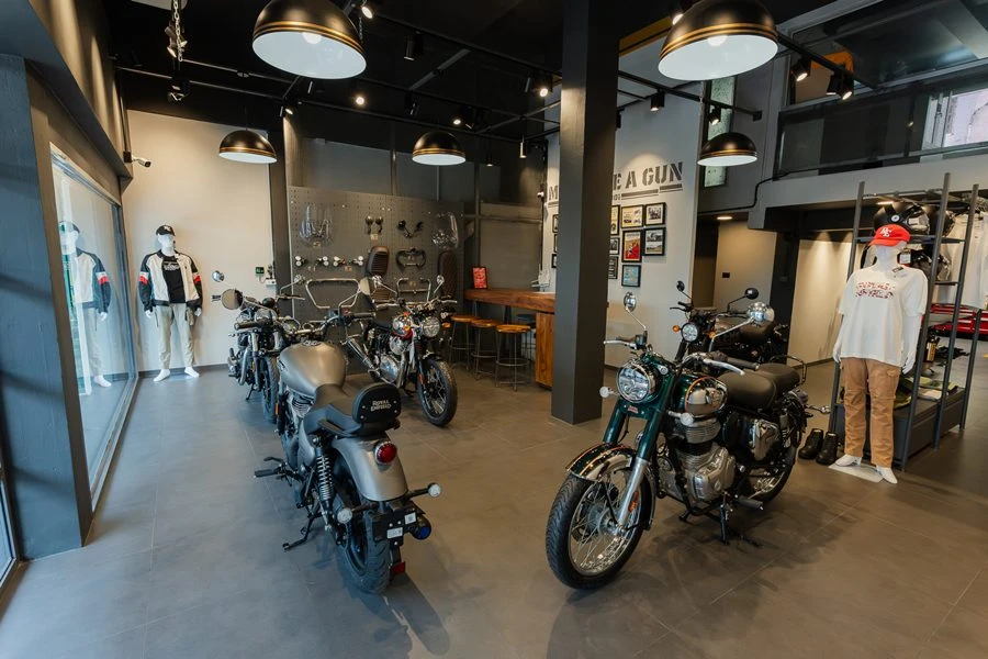 โชว์รูม Royal Enfield สาขาพระรามสอง ได้รับการออกแบบที่ยังคงเอกลักษณ์ของแบรนด์ ที่ผสานความคลาสสิกเหนือกาลเวลาเข้ากับฟังก์ชันการใช้งานที่ทันสมัย เพื่อสร้างบรรยากาศที่เป็นมิตรและเข้าถึงได้ง่ายสำหรับผู้ที่สนใจในโลกของการขี่มอเตอร์ไซค์ ไม่ว่าจะเป็นผู้ที่กำลังมองหารถมอเตอร์ไซค์คันแรก ผู้ที่เปิดรับไลฟ์สไตล์การขี่ที่หลากหลาย หรือผู้ที่หลงใหลและอยากสัมผัสจิตวิญญาณของ Pure Motorcycling