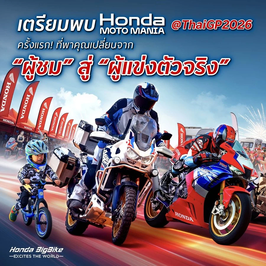 ไทยฮอนด้า ชวนแฟนสองล้อร่วมปลุกความมันส์ในงาน “Honda Moto Mania 2026” ที่ชวนมา Enjoy The World of Honda Motorcycle สัมผัสโลกมอเตอร์สปอร์ตครบทุกมิติ ทั้งการแข่งขัน ความรู้ และความสนุกในพื้นที่เดียว ระหว่างวันที่ 27–28 กุมภาพันธ์ 2569 ณ BRIC Drift Track สนาม Chang International Circuit จังหวัดบุรีรัมย์ ภายในงาน PT Grand Prix of Thailand 2026 เปิดรับสมัครแล้วผ่าน Honda BigWing และ Wing Center ทั่วประเทศ