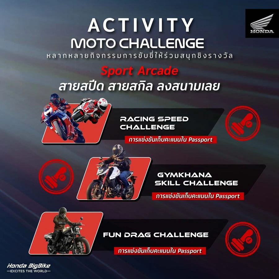 - Gymkhana Skill Challenge ทดสอบทักษะควบคุมรถในสนามเทคนิคด้วย Honda CB500F (รถจาก Thai Honda) คูปอง 1 ใบ ลงแข่งได้ 1 ครั้ง แข่งขันทั้งหมด 2 รอบสนาม/ครั้ง จัดอันดับจากเวลารวมดีที่สุด ผู้ที่ทำเวลารวมได้เร็วที่สุด 3 อันดับ จะได้รับเงินรางวัล และของรางวัล โดยเก็บคะแนนใน Honda Passport
