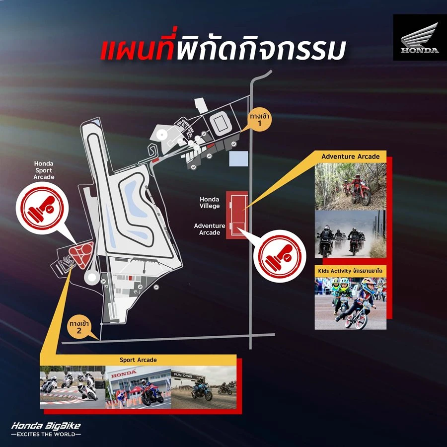 Honda Moto Mania 2026 จัดเต็มกิจกรรมไฮไลต์ถึง 5 รูปแบบ แบ่งเป็น 2 โซนหลัก ได้แก่ Sport Arcade และ Adventure Arcade ครอบคลุมทั้งการแข่งขันทางเรียบ สนามเทคนิค และกิจกรรมสายแอดเวนเจอร์