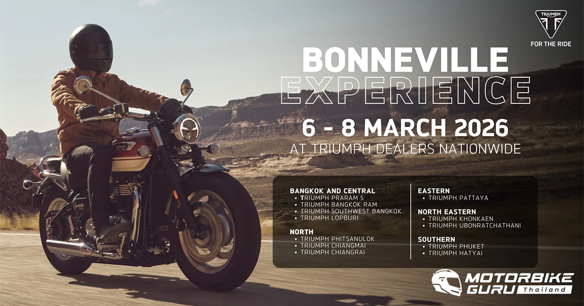 ไทรอัมพ์ มอเตอร์ไซเคิลส์ จัดกิจกรรม “Bonneville Experience Demo Day” กลับมาอีกครั้งกับการยกทัพรถจักรยานยนต์ตระกูลโมเดิร์น คลาสสิก ปี 2026 หลากหลายรุ่นยอดนิยมมาให้ลูกค้าได้สัมผัสประสบการณ์ทดลองขับขี่ เพื่อทดสอบสมรรถนะของรถอย่างเต็มอิ่ม ไม่ว่าจะเป็น Bonneville T100, Bonneville T120, Bonneville T120 Black, Bonneville Bobber, Bonneville Speedmaster, Scrambler 1200 XE พร้อม Speed Twin 900 และ Speed Twin 1200 RS พร้อมรับข้อเสนอสุดพิเศษ เพื่อให้สามารถเป็นเจ้าของรถจักรยานยนต์รุ่นที่ชอบได้ง่าย ทั้งนี้ลูกค้าและผู้สนใจสามารถเข้าร่วมกิจกรรม Bonneville Experience Demo Day ตั้งแต่วันที่ 6 - 8 มีนาคม 2569 ณ โชว์รูมผู้แทนจำหน่ายไทรอัมพ์ 12 แห่งทั่วประเทศ โดยสามารถจองคิวเข้ารับบริการทดลองขี่ล่วงหน้าได้ผ่านทาง www.triumphmotorcycles.co.th