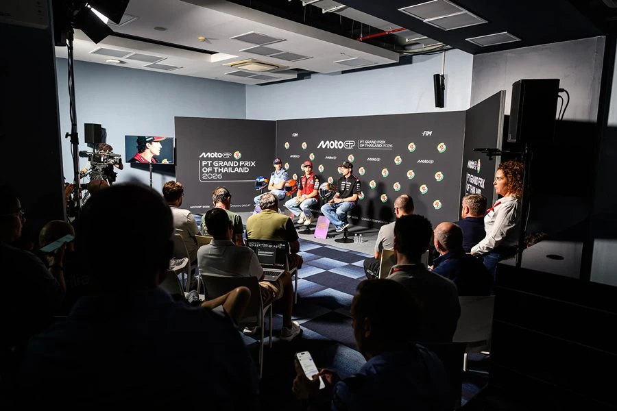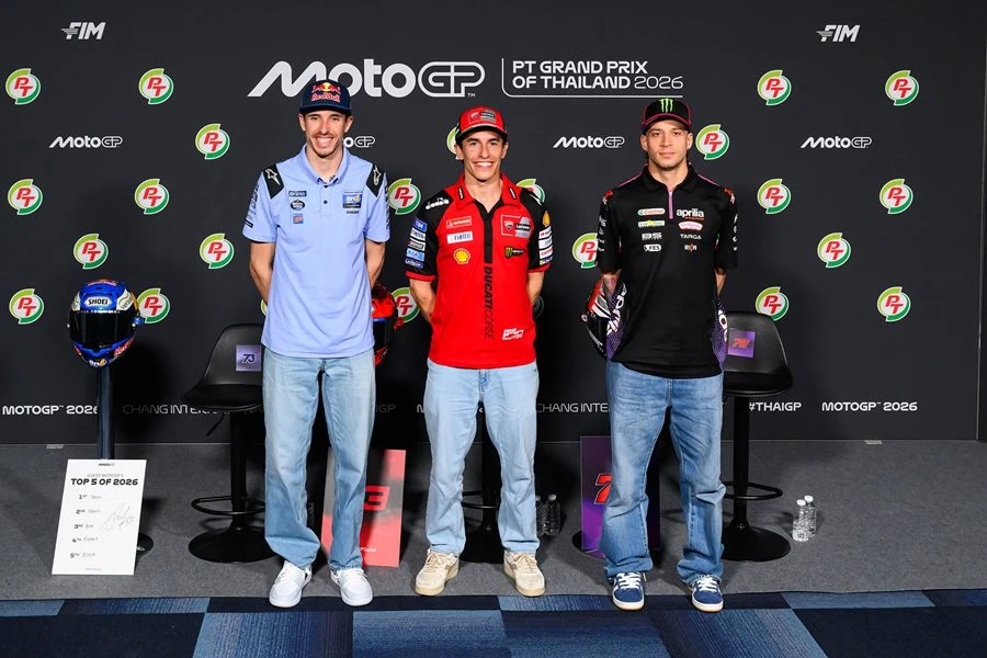 มาร์ค มาร์เกซ ยอดนักบิดสแปนิชแชมป์โลก 7 สมัย ควงคู่ อเล็กซ์ มาร์เกซ รองแชมป์โลก และ มาร์โก เบซเซ็คคี หนึ่งในตัวเต็งแถลงข่าวอย่างเป็นทางการ เปิดฉากศึกมอเตอร์สปอร์ตสองล้อเบอร์หนึ่งของโลกอย่าง “โมโตจีพี 2026” ที่เข้าสู่โปรแกรม “พรีเรซ” ที่ สนามช้าง อินเตอร์เนชั่นแนล เซอร์กิต จ.บุรีรัมย์ พร้อมการถ่ายภาพประวัติศาสตร์บันทึกทำเนียบนักบิดทุกรุ่น ก่อนดวลเดือดในรายการ “พีที กรังด์ปรีซ์ ออฟ ไทยแลนด์” สุดสัปดาห์นี้