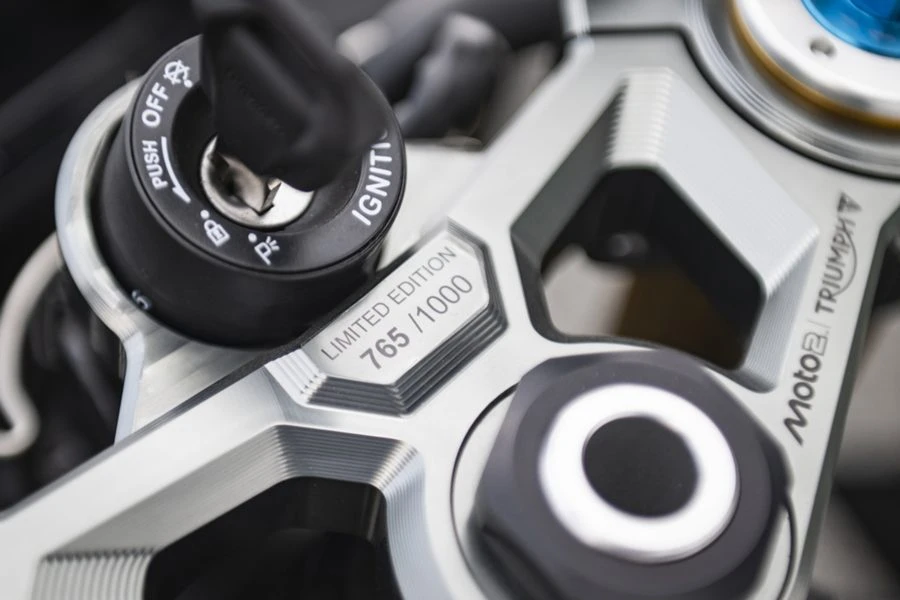 รถจักรยานยนต์ Street Triple Moto2™ Edition แต่ละคันจะมีหมายเลขกำกับประจำตัวที่ไม่ซ้ำกันบนแผงคอที่ขึ้นรูปเป็นพิเศษ ซึ่งสลักโลโก้ Moto2™ อยู่ด้วย โดยติดตั้งอยู่ข้างจอแสดงผล TFT ที่ทุกครั้งที่หน้าจอเริ่มต้นการทำงาน จะมีโลโก้ Moto2™ ปรากฏขึ้น นอกจากนี้ยังจะมีการสลักชื่อและตราสัญลักษณ์ Triumph Triple Trophy ลงไปเพื่อเพิ่มความพิเศษ ตอกย้ำสถานะความเป็นรถรุ่นลิมิเต็ด เอดิชันและดึงดูดความน่าสนใจสำหรับนักสะสม