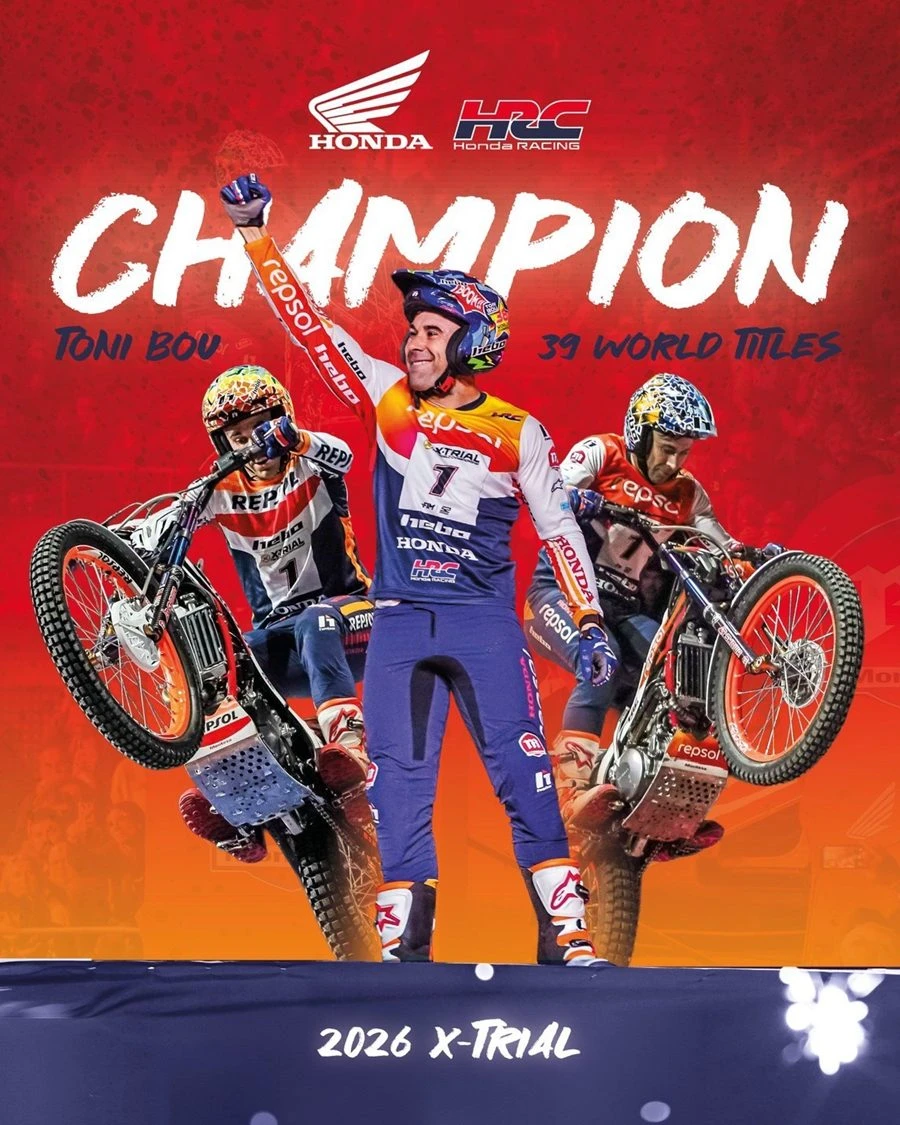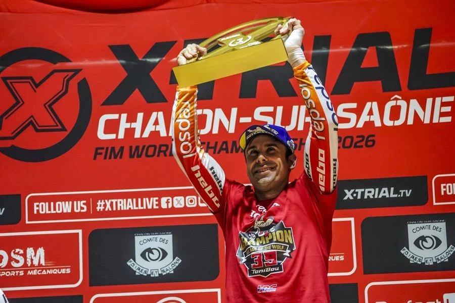“โทนี่ โบ” ยอดนักบิดไต่เขาชาวสเปน ต่อยอดตำนานความสำเร็จอีกครั้งในการแข่งขัน ศึก X-Trial World Championship 2026 เปิดศึกดวลทีมเมท Repsol Honda HRC ในรอบไฟนอลสนาม 8 ที่ชาลอง-ซูร์-โซเน ประเทศฝรั่งเศส (Chalon-sur-Saône, France) ก่อนคว้าชัยชนะมาครอง พร้อมบวกคะแนนสะสมทิ้งห่าง คว้าแชมป์โลกได้ทันที แม้ยังเหลือการแข่งขันอีก 2 สนามก็ตาม เป็นแชมป์สมัยที่ 20 ของการแข่งขันแบบอินดอร์และเป็นแชมป์สมัยที่ 39