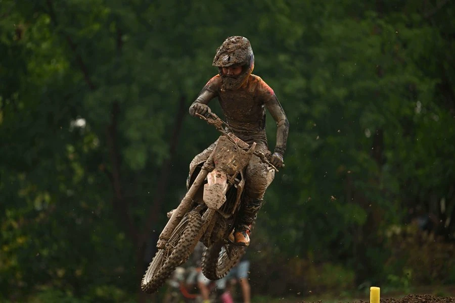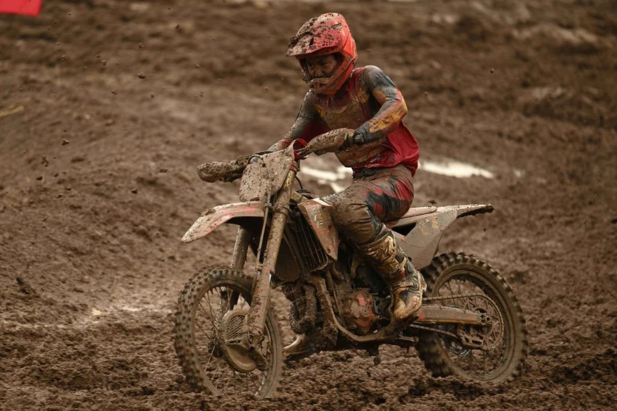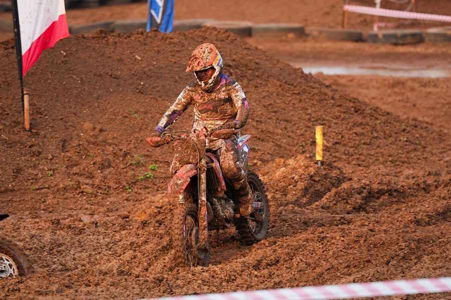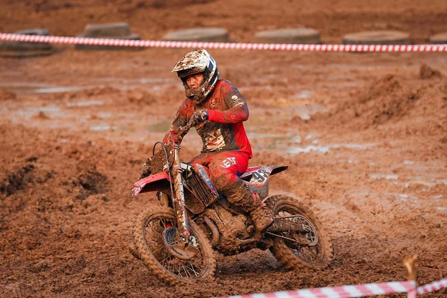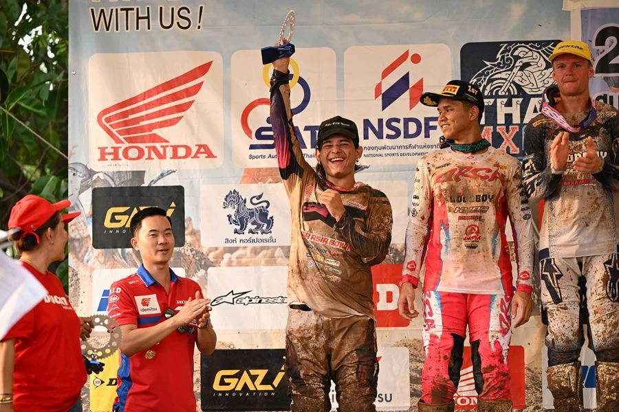 “ไตรตั้น” เตโชดม มีแสง หมายเลข 193 จากทีม Honda Racing Thailand Idemitsu Wannalak Motorsport ทะยานรถแข่ง Honda CRF250R ระเบิดโคลนขึ้นโพเดียมในอันดับที่ 3