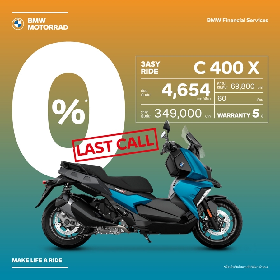 สกู๊ตเตอร์สุดล้ำที่มาพร้อมฟังก์ชั่นจัดเต็มใน BMW C 400 X ให้คุณได้เป็นเจ้าของได้ในราคาเริ่มต้นที่ 349,000 บาท ดาวน์เริ่มต้นที่ 69,800 บาท ผ่อนเริ่มต้นที่ 4,654 บาท/เดือน พร้อมข้อเสนอพิเศษพฤศจิกายนนี้