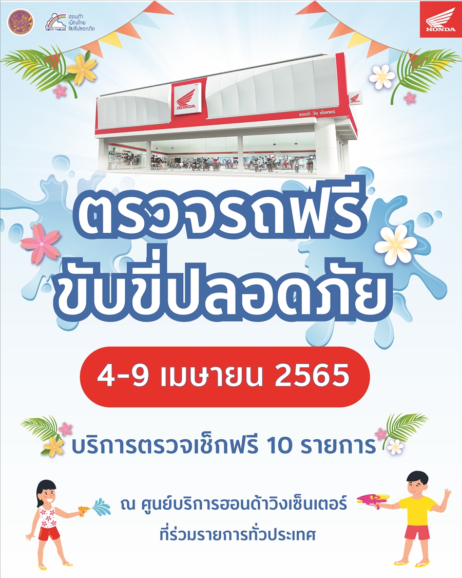 ฮอนด้า มอบบริการพิเศษภายใต้แคมเปญ ตรวจรถฟรี ขับขี่ปลอดภัย เพื่อสร้างความอุ่นใจให้กับผู้ใช้รถจักรยานยนต์ฮอนด้า ก่อนเดินทางในช่วงเทศกาลสงกรานต์ ด้วยบริการตรวจเช็กรถฟรี 10 รายการ พร้อมเปลี่ยนถ่ายน้ำมันเครื่องในราคาพิเศษเพียง 39 บาทเท่านั้น และมอบส่วนลดพิเศษสำหรับอะไหล่ประเภทยางใน ผ้าเบรก หัวเทียน ไส้กรองอากาศ และหลอดไฟ ลดสูงสุดถึง 30% (เฉพาะรุ่นที่กำหนด) เพื่อให้ลูกค้าได้ใช้รถอย่างปลอดภัย